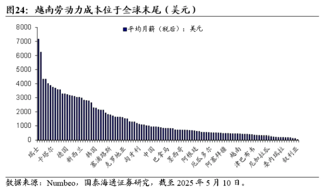 薪酬成本优势显著,越南劳动力最新平均税后月薪约430美元,位列全球后25%,远低于美国、德国、英国及中国等经济体,低廉的用工成本为企业满足用工需求、扩大生产规模提供了基础。