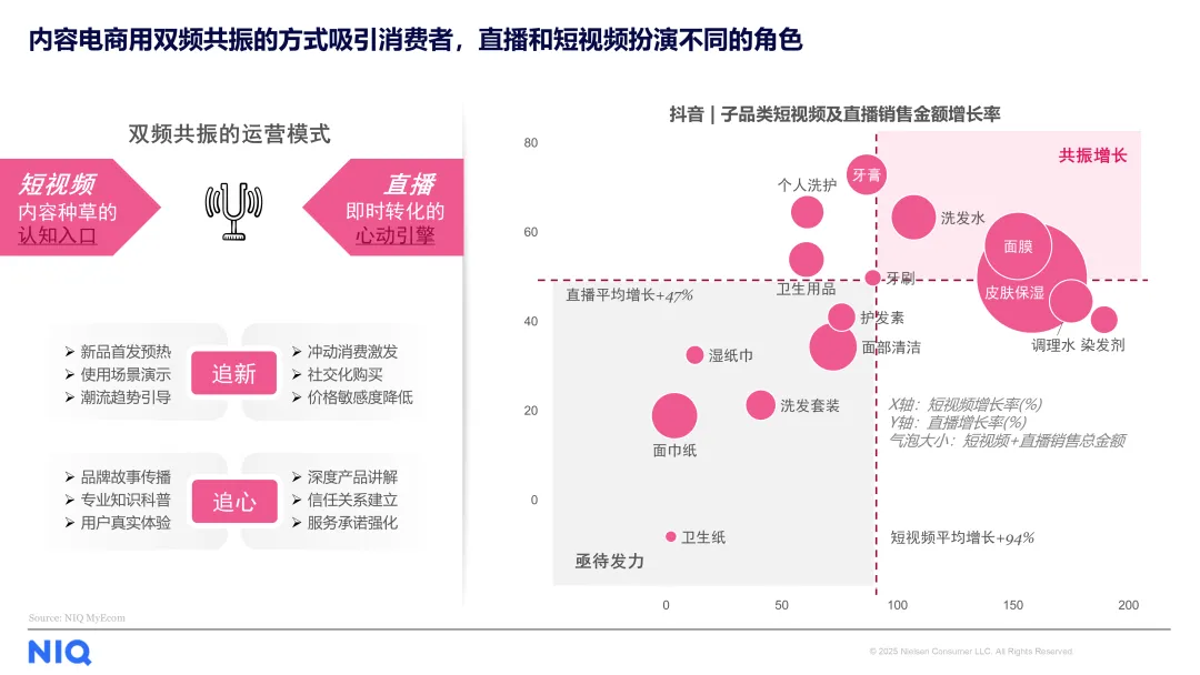 从消费者体验角度来看,渠道购物包含了“买东西”“逛商店”“遇知音”这三种不同的体验。线下渠道中,商超通过“调改焕新”重获活力,个护品类销售额有显著提升,化妆品连锁店在过去几年中汰弱留精,凭借专精体验留住消费者,店铺数量增长率达到3%;线上渠道中,内容电商平台以“短视频种草+直播转化”的双频共振模式成为增长引擎,既满足了消费者的冲动尝新需求,又通过官方授权、价格优势抢夺理性消费者,高端品牌直播间销售额大幅增长。