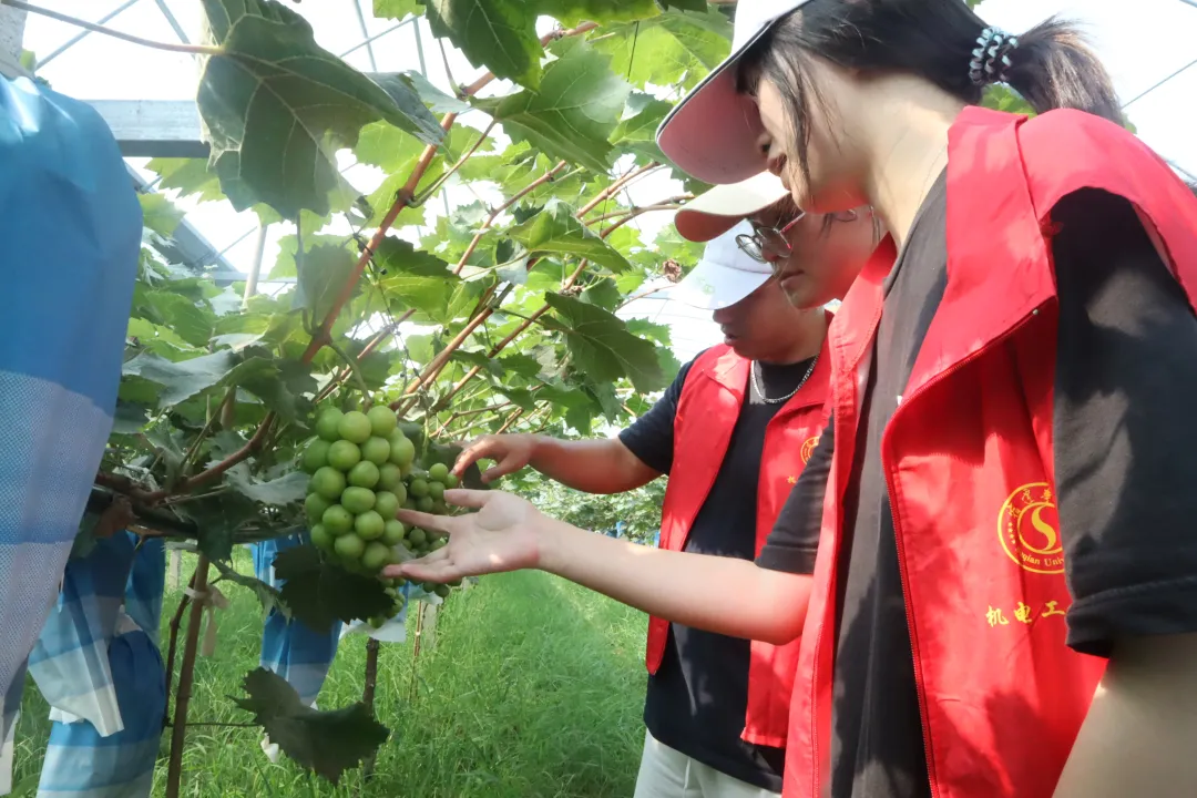 最后,他们走进临河镇杨工村种植“阳光玫瑰”品种的葡萄基地。基地负责人介绍,该品种较易栽培、挂果期长、果粒着生紧密,具有浓郁的玫瑰香味,鲜食品质极优,正是由“头雁竞飞,村村竞赛”党建项目的引领,一、二期扩建到140亩,20个大棚,预期收益每亩1.5万元。实践团队深入田间地头,去了解农事新声,结合自身的专业知识解决农业种植中遇到的困难,厚植知农、爱农、兴农情怀,在田野中练就兴农本领,在乡村振兴的大舞台上奉献青春。