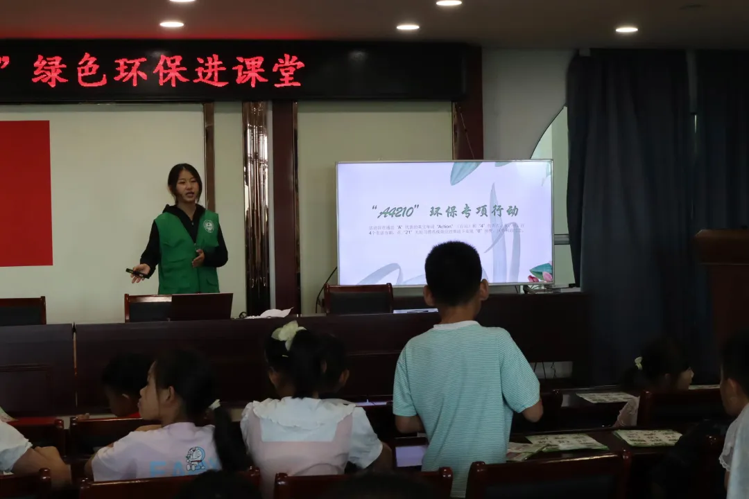 实践团队还围绕美丽乡村建设,开展绿色环保进课堂活动,宣传习近平生态文明思想,展示“江苏生态大公园”建设的成就,宣传低碳发展理念和政策,普及绿色、环保、低碳生活小常识,宣传生物多样性,鼓励孩子们积极参与“A4210”环保行动。