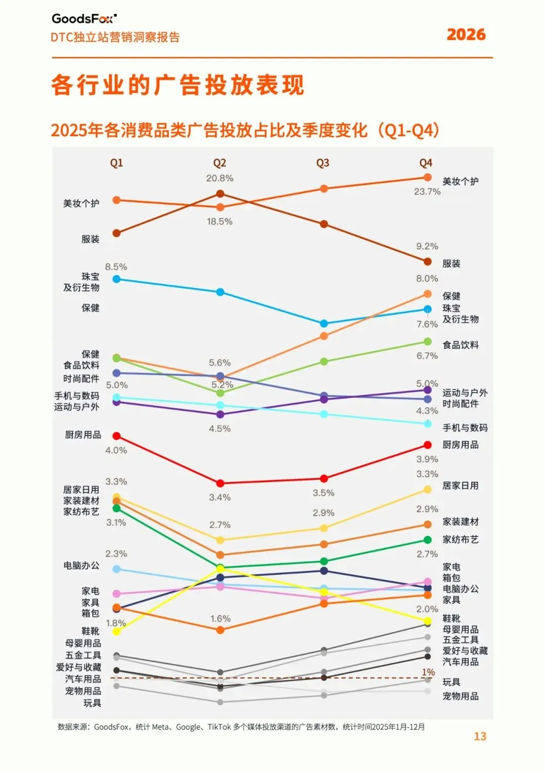 报告指出,在2025年全球广告投放市场中,北美和西欧占据主导地位,但新兴市场如东南亚、南亚和非洲也在崛起。美国市场广告投放节奏快,新素材占比高,而英国、澳大利亚等成熟市场则更注重稳态扩张。各行业广告投放中,美妆个护和保健品类表现突出,但服装品类面临政策和竞争挑战。