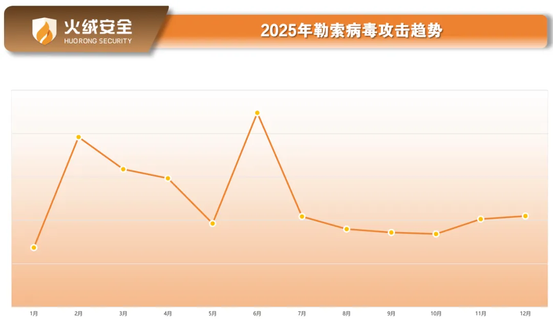 根据2025年勒索病毒相关统计数据,火绒安全在2025年拦截到的勒索病毒攻击总量较2024年仅呈小幅上升,整体未出现明显“爆发式增长”,但勒索威胁仍需保持警惕。从全年趋势来看,勒索攻击在上半年相对更为活跃,并于6月达到阶段性峰值;进入下半年后,攻击规模整体趋于平稳。