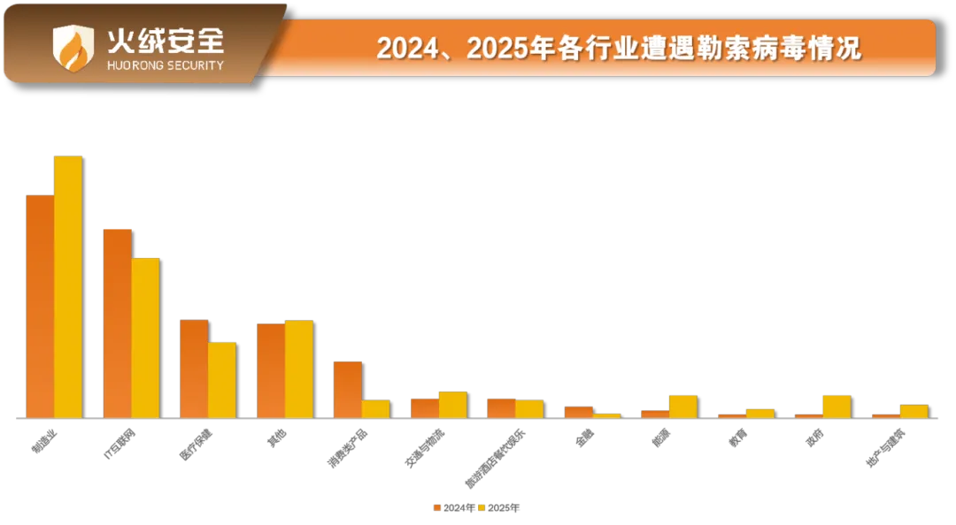 对2025年勒索软件攻击组织的受害行业分布进行分析可见,制造业、IT与医疗保健领域仍是主要攻击目标,同时,能源和政府部门相较2024年呈现出一定程度的攻击倾向上升。从数据层面来看,2025年企业遭受勒索攻击的次数较2024年有所下降,但勒索攻击的破坏性与潜在业务影响仍然突出,风险不容忽视。