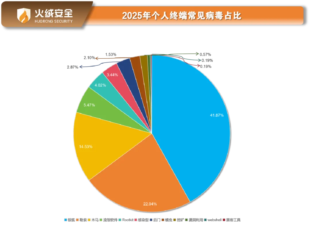个人终端常见病毒TOP3中,银狐病毒以41.87%位居前列,紧随其后的是勒索病毒(22.94%)、木马病毒(14.53%)。