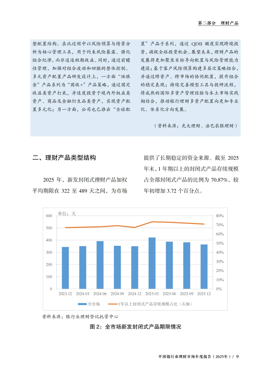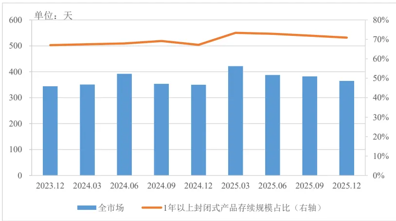 期限长期化趋势明显:1年期以上封闭式产品存续规模占比70.87%,新发封闭式产品加权平均期限在322–489天之间,为市场提供长期稳定资金。
