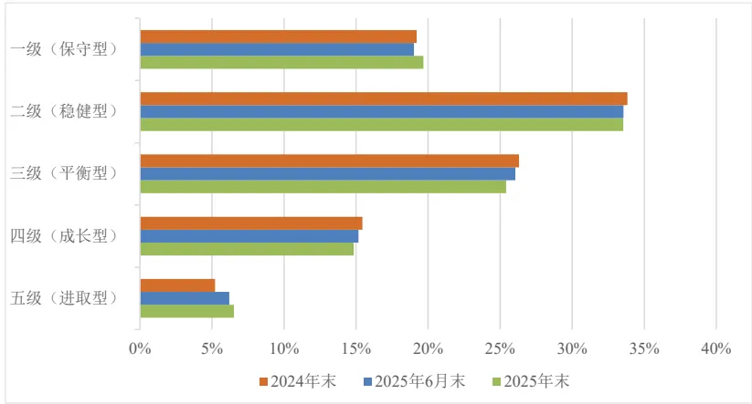 风险偏好分化加剧:二级(稳健型)投资者占比最高(33.54%),但保守型、进取型占比分别提升0.48、1.30个百分点,反映投资者在低利率环境下寻求收益与风险的再平衡。