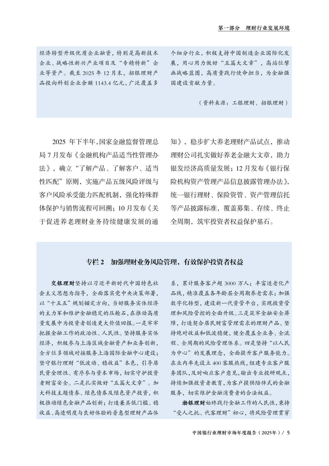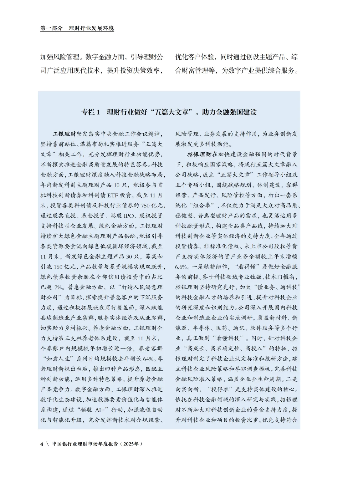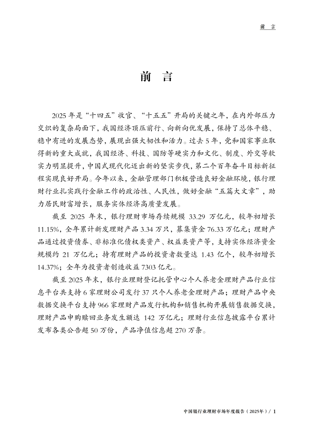 2025年是“十四五”收官、“十五五”开局的关键之年,在内外部压力交织的复杂局面下,我国经济顶压前行、向新向优发展,保持了总体平稳、稳中有进的发展态势,展现出强大韧性和活力。过去5年,党和国家事业取得新的重大成就,我国经济、科技、国防等硬实力和文化、制度、外交等软实力明显提升,中国式现代化迈出新的坚实步伐,第二个百年奋斗目标新征程实现良好开局。今年以来,金融管理部门积极营造良好金融环境,银行理财行业扎实践行金融工作的政治性、人民性,做好金融“五篇大文章”,助力居民财富增长,服务实体经济高质量发展。