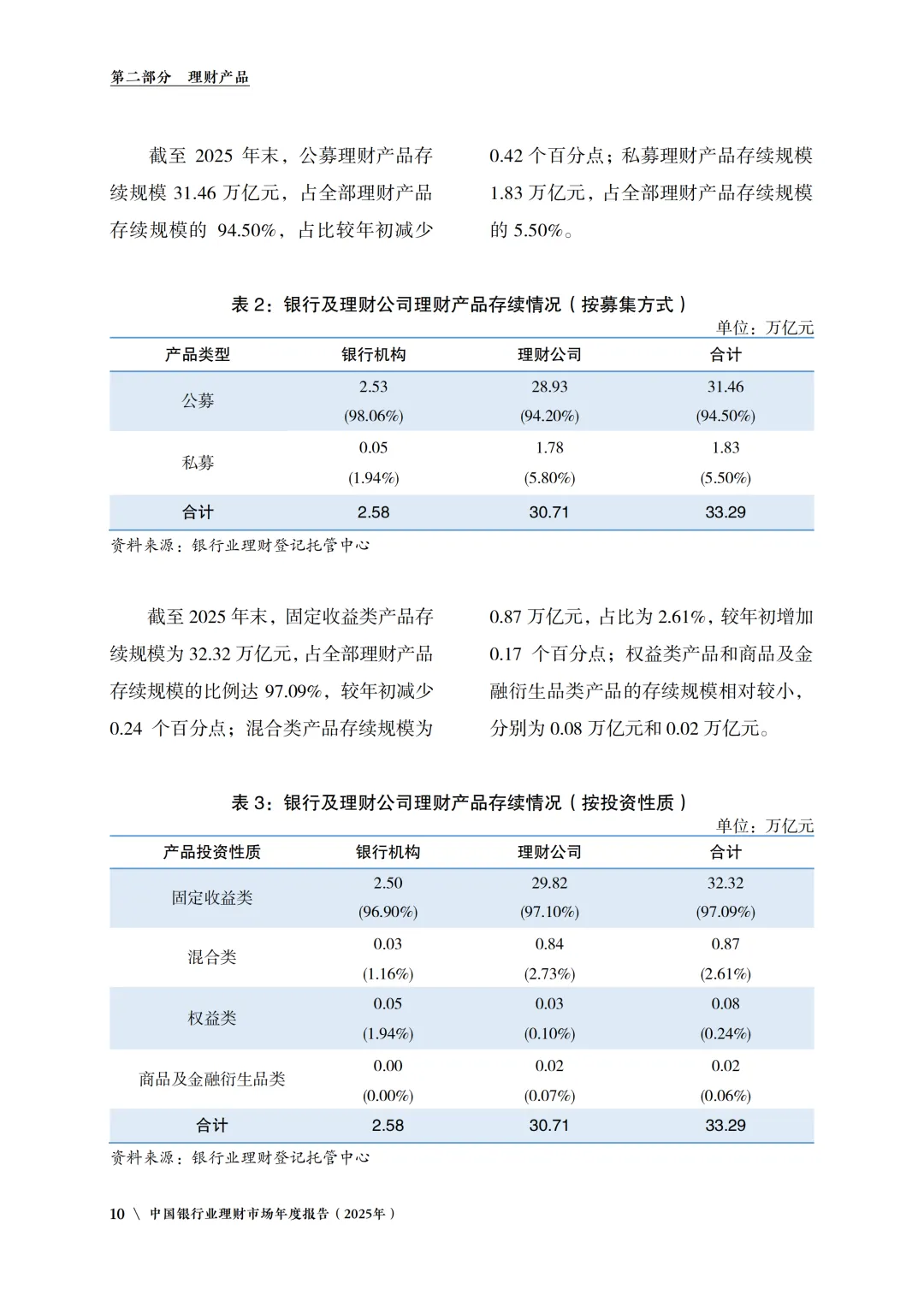 截至2025年末,银行理财市场存续规模33.29万亿元,较年初增长11.15%,全年累计新发理财产品3.34万只,募集资金76.33万亿元;理财产品通过投资债券、非标准化债权类资产、权益类资产等,支持实体经济资金规模约21万亿元;持有理财产品的投资者数量达1.43亿个,较年初增长14.37%;全年为投资者创造收益7303亿元。