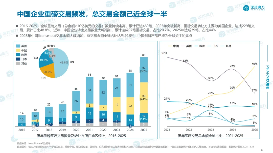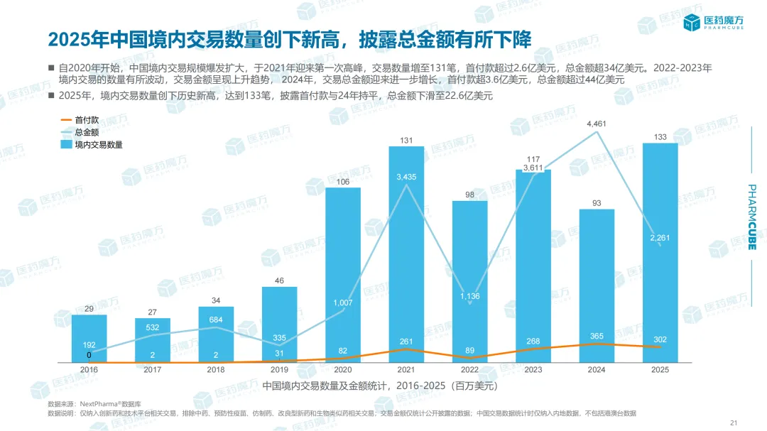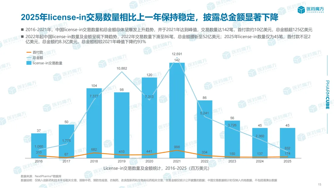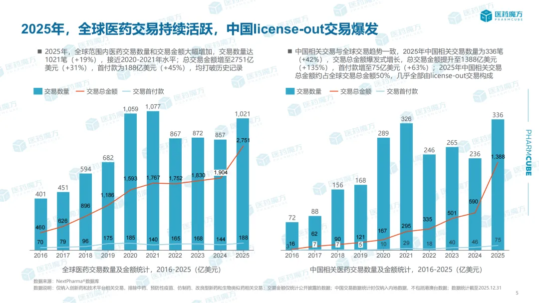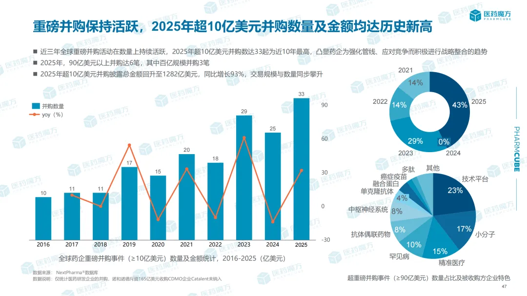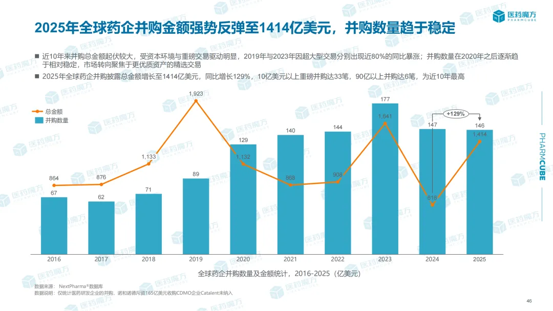 医药魔方MedAlpha新药投融资数据库显示,2025年全球并购总计144起,总金额达到1430.27亿美元。2023年这一数字为148起,总金额达1570.26亿美元。