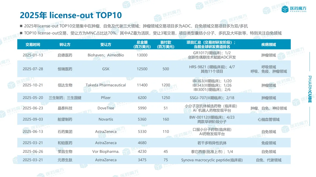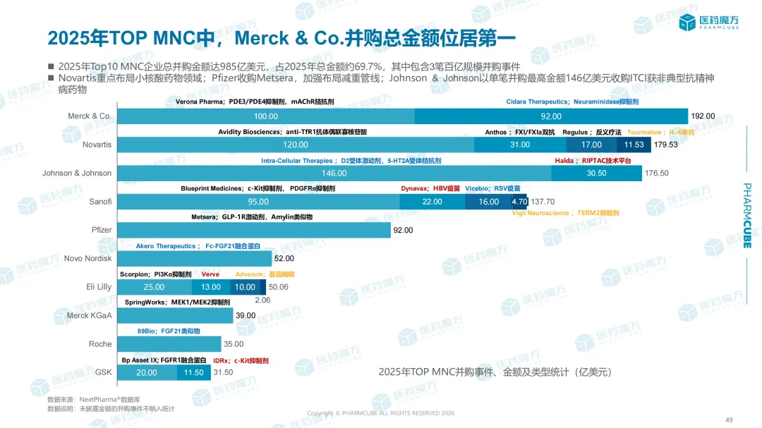 当中并购金额过百亿美元的有4起,出自强生、诺华、默沙东和辉瑞之手。