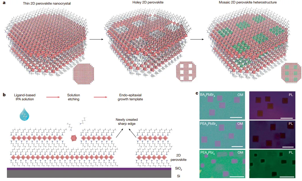 中国科学技术大学团队在《自然》发表成果,攻克了二维离子型软晶格半导体精密加工的世纪难题。他们不再使用可能损伤材料的传统光刻,而是创新性地引导材料内部应力进行“自刻蚀”,像编程一样在单晶内部“雕刻”出规则孔洞,再填充不同材料,最终形成原子级平整的“马赛克”异质结。这项突破为未来高性能、可定制化光电器件提供了前所未有的理想材料平台。