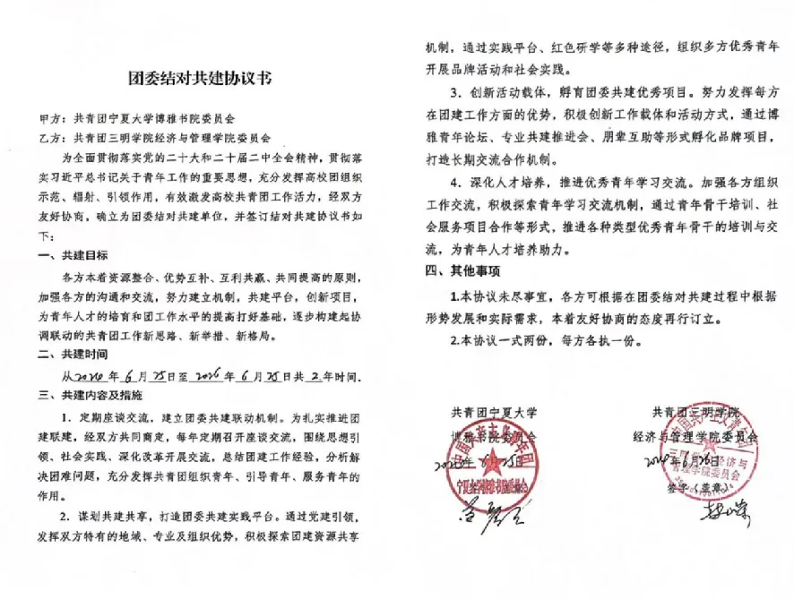 充分发挥团组织的桥梁纽带作用,与上海大学管理学院团委、宁夏大学博雅书院团委、明溪团县委、三明联通公司等地方社区团组织等多家单位建立共建关系,构建了协同育人的良好生态。