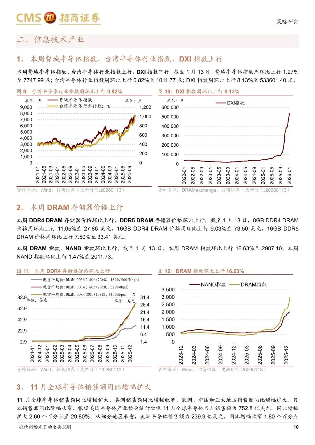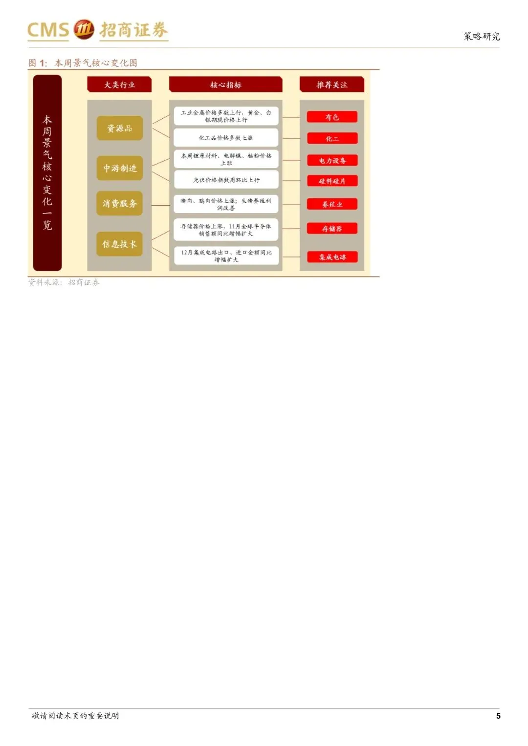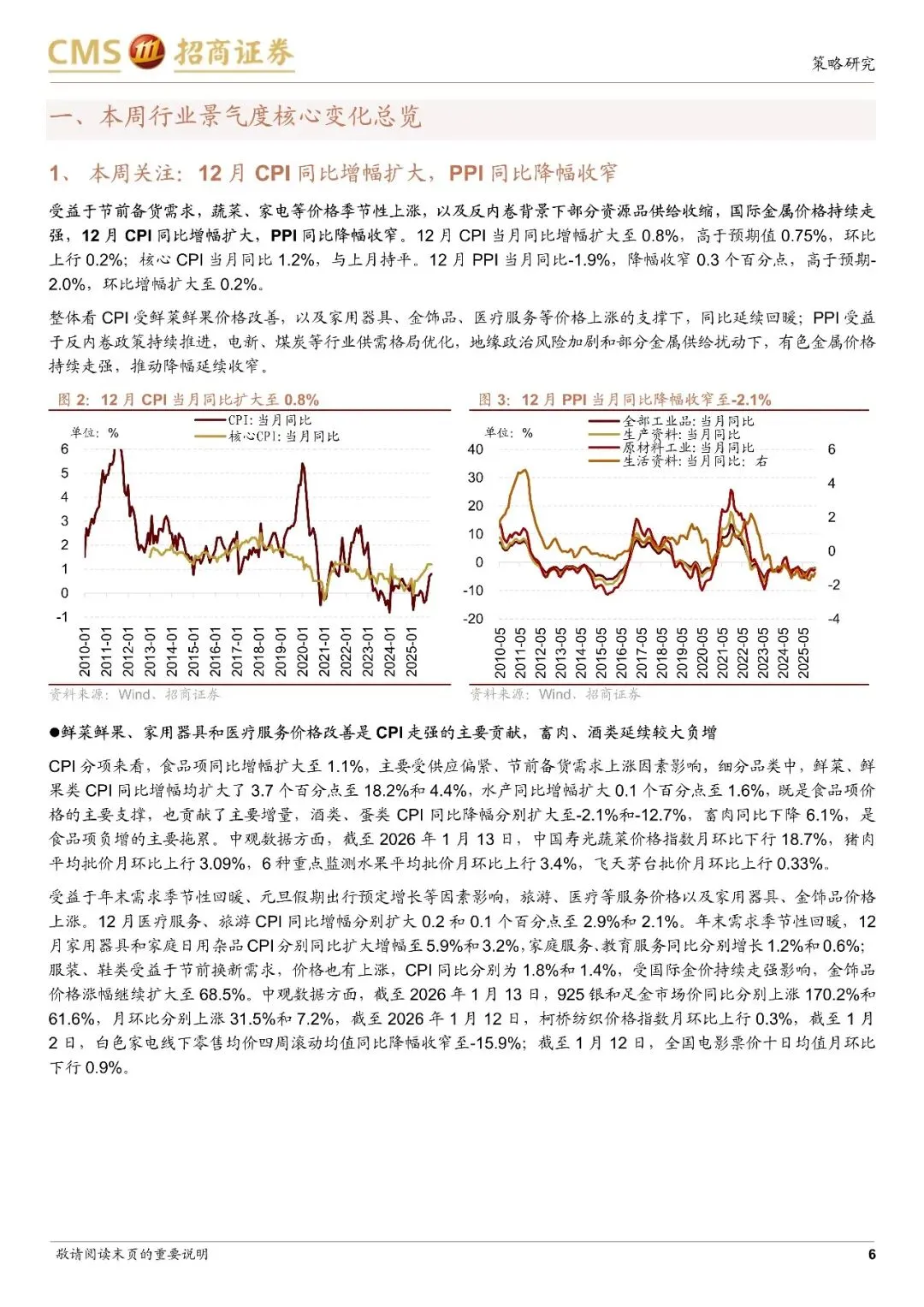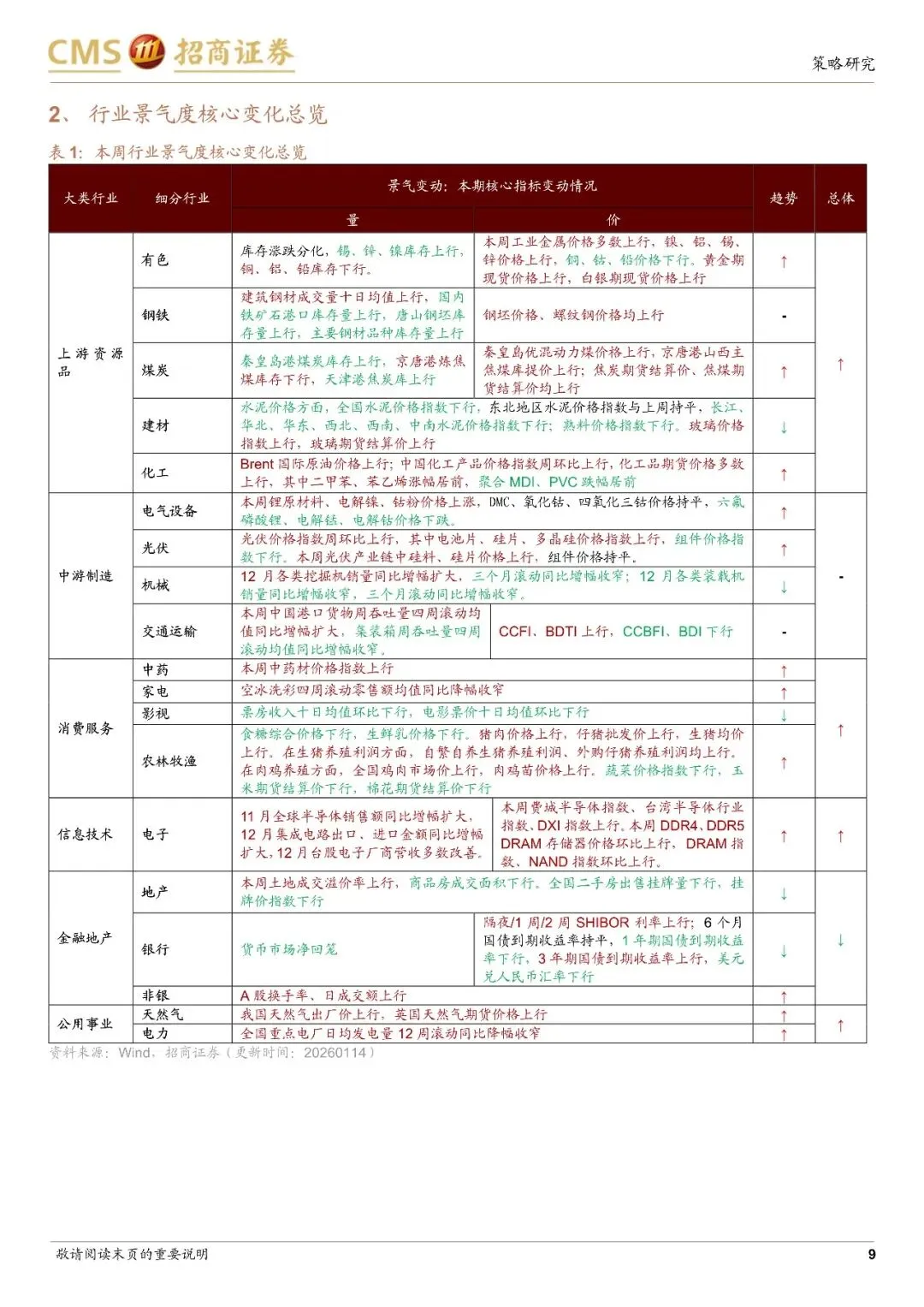 本周景气度改善的方向主要在资源品、消费服务和信息技术领域。上游资源品中,金属、化工品价格多数上涨;中游制造领域,新能源产业链价格多数上涨,12 月重卡销量三个月滚动同比增幅收窄。信息技术中,存储器价格持续上涨,1 月各类挖掘机、装载机销量三个月滚动同比增幅收窄。消费服务领域,猪鸡价格上行,中药材价格上涨。12 月 CPI 同比增幅扩大,PPI 降幅持续收窄。推荐景气较高或有改善的有色、化工、电力设备、养殖业、存储器、集成电路等。