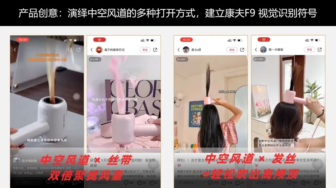 例如微思敦第十六届虎啸奖银奖“康夫F9”案例。在头部品牌已经把参数战打到极致的背景下,微思敦围绕用户真实的需求场景,在早八场景中植入康夫F9“3分钟速干=可以多睡半小时”;在发型设计场景植入“中空风道=轻松吹出高颅顶的产品卖点。