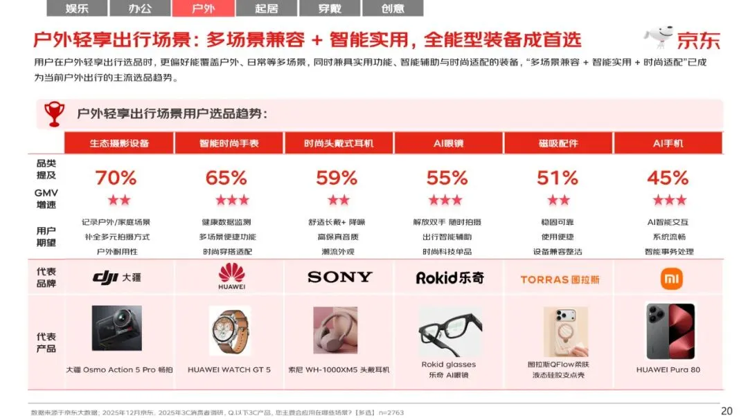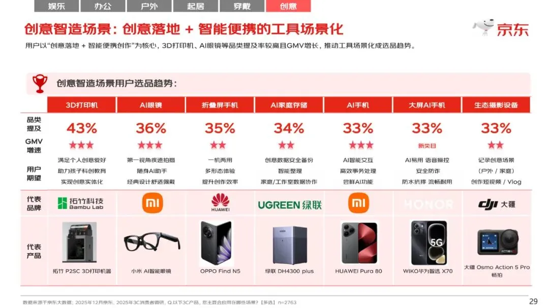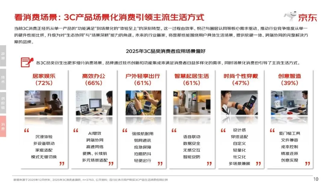 调研显示2025年3C品类消费者应用场景偏好主要为:居家娱乐、高效办公、户外轻享出行、智慧起居生活、时尚个性穿戴、创意制造六大细分场景。