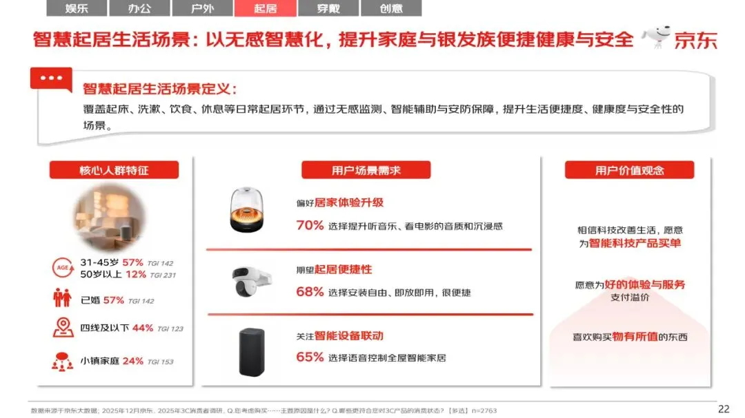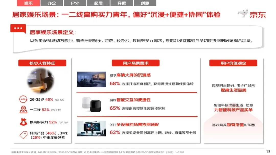 例如在居家娱乐场景中,一二线高购买力的青年人为核心消费人群,他们愿意购买数码、电子产品来提高生活品质,愿意为智能科技产品买单、为物有所值的东西买单。