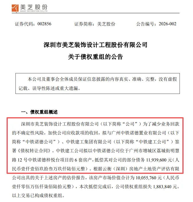 1月5日,美芝股份(SZ002856)公告债权重组,拟与广州中铁诺德置业有限公司、中铁建工集团有限公司签署《债权转让合同》。