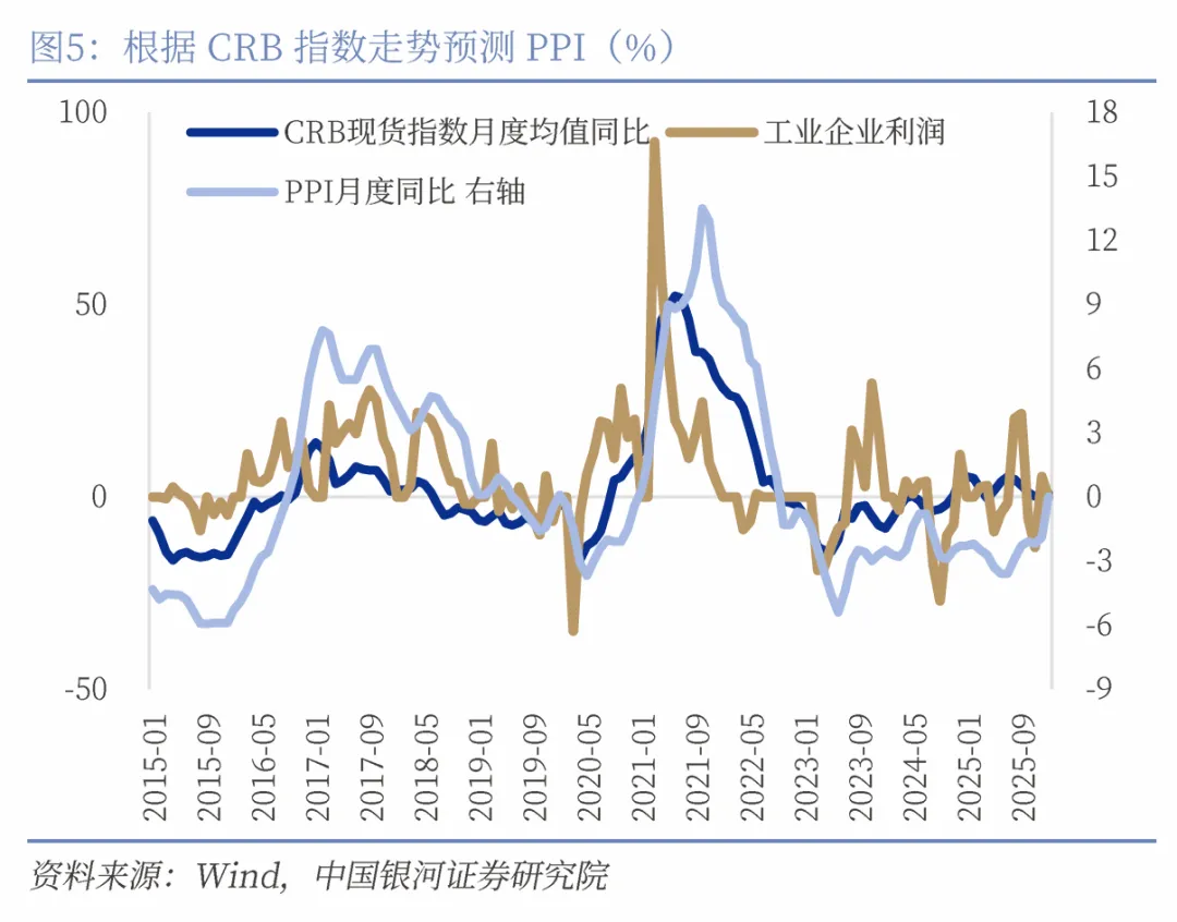 量、价、利润率齐升。从量、价、利润率三要素来看,三要素均出现回升。出口强劲上行带动工业生产,12月工业增加值同比增速为5.2%(前值4.8%)。出口数据在12月的强势上升为工业增加值带来了支撑。12月出口同比增速回升至6.6%(前值5.9%)。汽车、集成电路和手机出口增速加快,对应地计算机电子设备和汽车制造业增加值分别增长11.8%和8.3%。同时,高技术制造业和装备制造业继续发挥拉动作用,增速明显快于规模以上工业。PPI延续修复,12月PPI环比上涨0.2%(前值0.1%),同比增速-1.9%(前值-2.2%)。一方面,反内卷政策对部分上游原材料行业形成支撑;另一方面,贵金属、铜等部分大宗商品价格走强,也带动了相关行业价格的同步上行。这些大宗商品价格上涨主要受到地缘政治风险推动的避险和储备需求以及科技革命带动的新能源、AI等部分领域需求增长影响。利润率同步改善,全年累计利润率达到年内最高的5.31%,环比提高0.02pct,同比降幅收窄至-0.08pct(前值-0.11pct)。分结构来看,制造业利润率延续改善态势,采矿业和电力、热力、燃气和水生产供应业的利润率较11月有所回落。