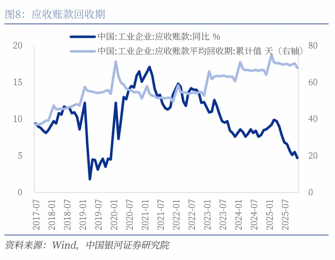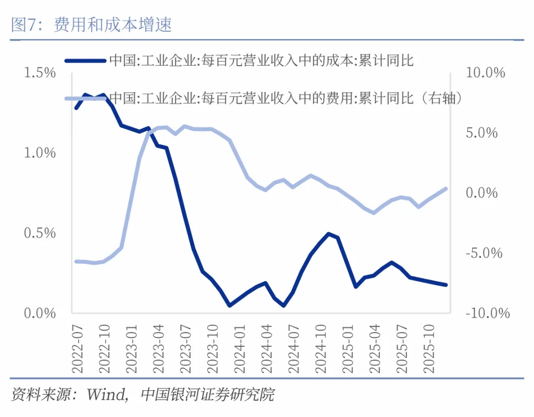 成本压力犹存,但资金周转出现改善。1—12月份,规模以上工业企业每百元营业收入中的成本为85.31元,同比增加0.16元;同时每百元营业收入中的费用为8.62元,同比减少0.02元。在反内卷和部分大宗商品价格上涨背景下,生产成本继续上行,同时费用率下降反映出企业仍在通过压降非生产性支出对冲成本上行。同时12月应收账款平均回收期为67.9天,同比增加3.6天,环比减少2.5天。同时12月产成品存货周转天数为19.9天,同比增加0.6天,环比减少0.6天。企业回款和库存周转效率在月内有所修复。其一,中央政治局会议明确提出“解决好拖欠企业账款和农民工工资问题”,政策层面对改善企业现金流形成支撑;其二,12月外需在高基数下仍保持较强表现,带动销售回款改善。