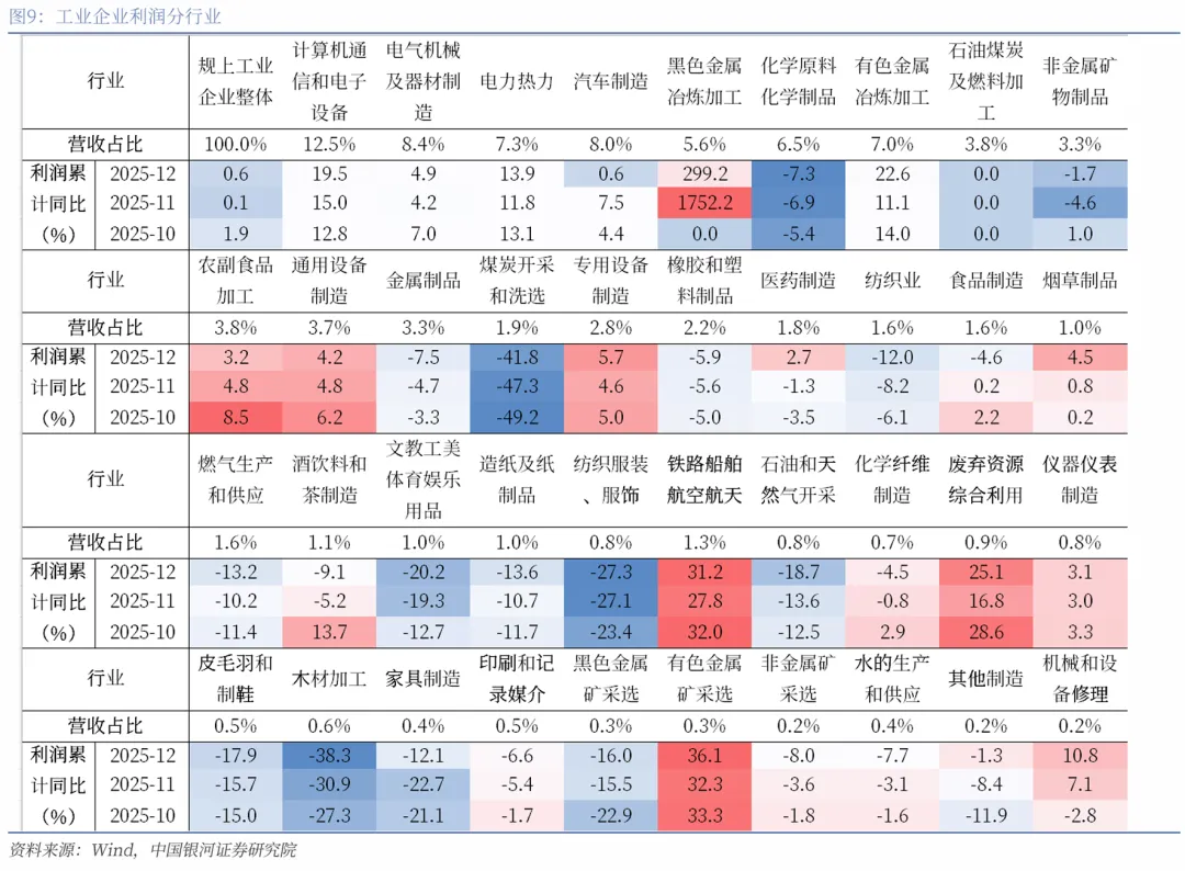 本文摘自:中国银河证券2026年1月27日发布的研究报告《利润增长收官,今年修复趋势有望延续——2025年1-12月工业企业利润分析》