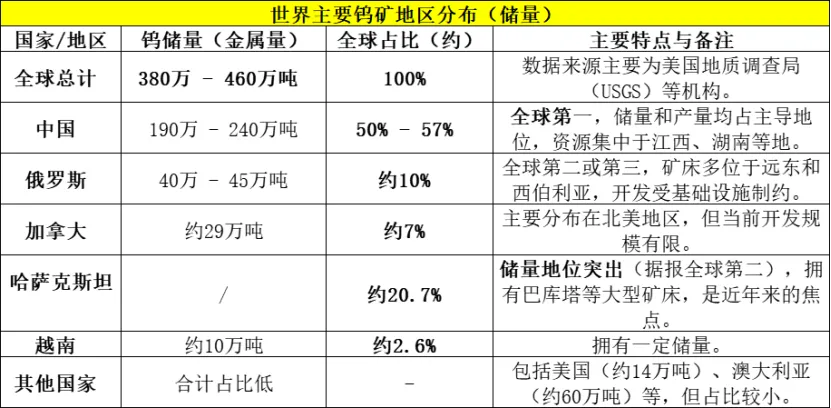 全球储量格局表现为中国主导,多极分布。钨资源主要分布于环太平洋与阿尔卑斯-喜马拉雅成矿带,中国储量占比过半。
