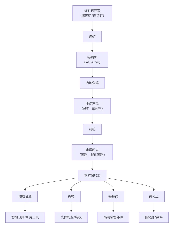 产业链始于钨矿石的开采。具备工业价值的钨矿主要是黑钨矿和白钨矿。矿石经过粗碎、研磨后,会采用重力选矿(如摇床、跳汰机)及浮选(尤其适用于低品位白钨矿)等工艺,得到钨精矿,其品位要求通常为三氧化钨含量不低于65%。中国的钨资源高度集中于湖南、江西、河南等省份。