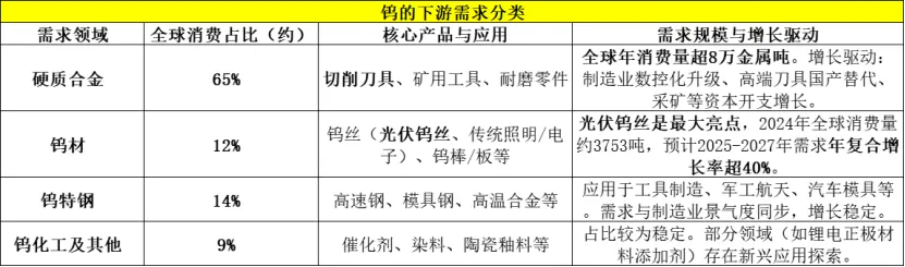 2)新兴领域:光伏钨丝(用于切割硅片的金刚线)是增长最快的领域之一 。此外,在半导体、核聚变等前沿科技领域的应用也在拓展 。