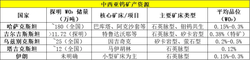 中西亚钨矿资源主要分布于哈萨克斯坦、乌兹别克斯坦、塔吉克斯坦和吉尔吉斯斯坦四国,其中哈萨克斯坦的储量与潜在产量最为突出。