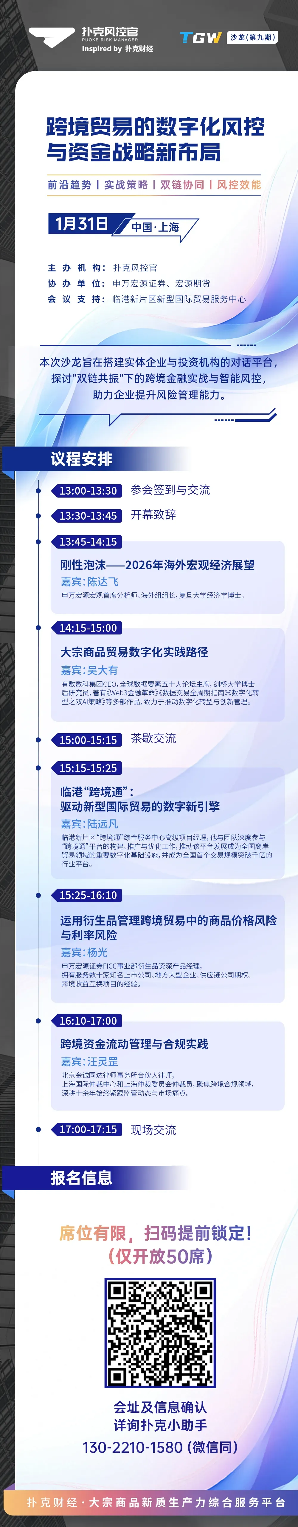 在这一背景下,依托扑克财经平台积累的产业与金融机构客户资源,我们将在1月31日举办一次主题为《跨境贸易的数字化风控与资金战略新布局》的沙龙,我们聚焦围绕大宗商品产业链风险管理的数字化创新,旨在为实体企业与投资机构搭建一个深度探讨大宗贸易数智化的高阶对话平台。