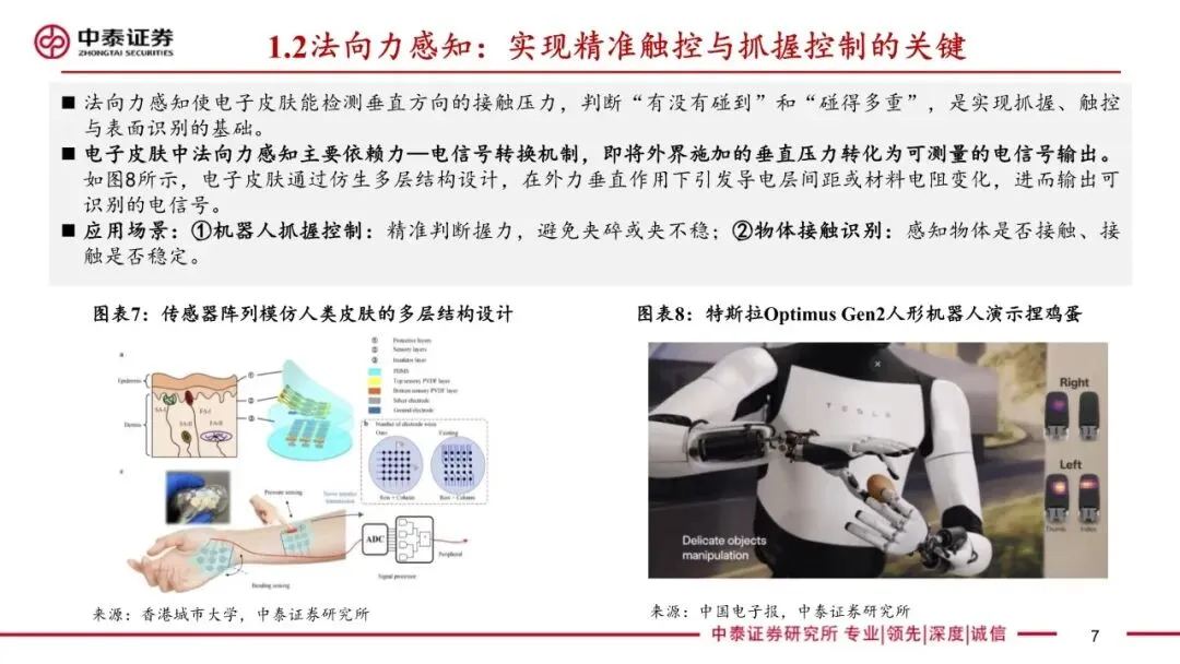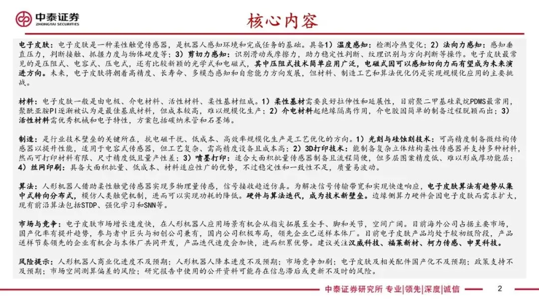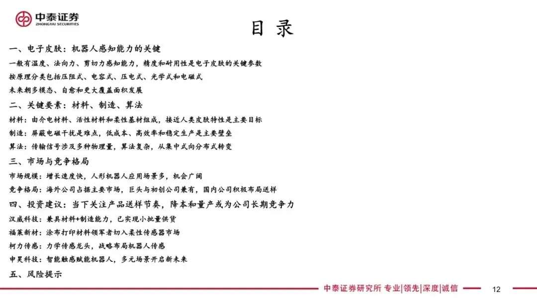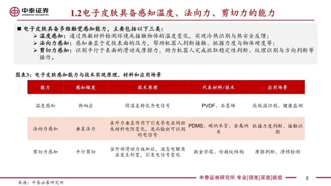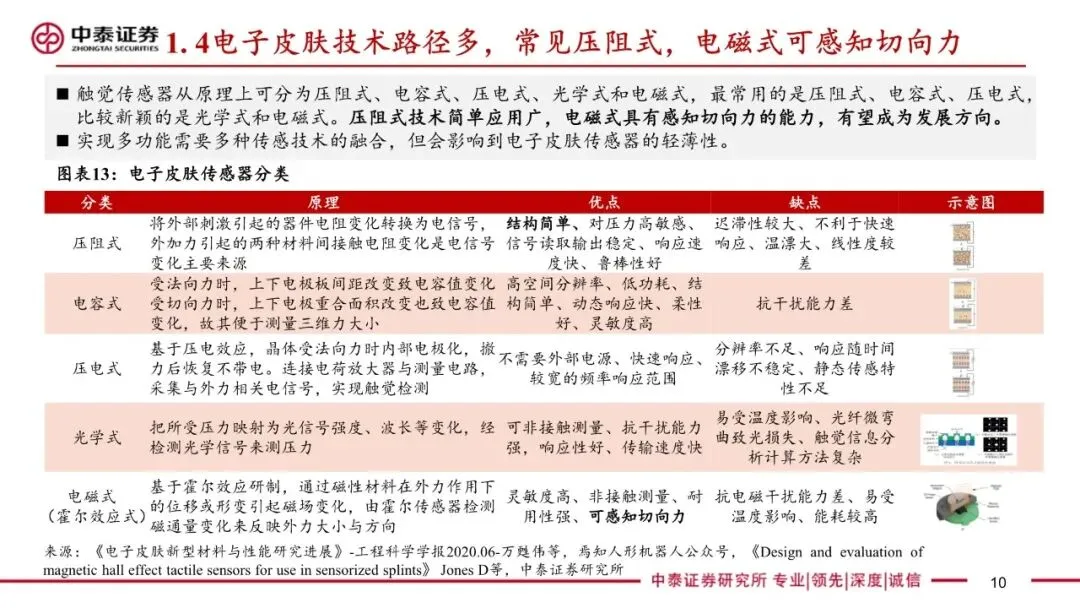 电子皮肤是一种柔性触觉传感器,是机器人感知环境和完成任务的基础。具备1)温度感知:检测冷热变化;2)法向力感知:感知垂直压力,判断接触、抓握力度与物体硬度等;3)剪切力感知:识别滑动或摩擦力,助力稳定性判断、纹理识别与方向判断等操作。电子皮肤最常见的是压阻式、电容式、压电式,还有比较新颖的光学式和电磁式,其中压阻式技术简单应用广泛,电磁式因可以感知切向力而有望成为未来演进方向。未来,电子皮肤将朝着高精度、长寿命、多模态感知和自愈能力方向发展,但材料、制造工艺和算法优化仍是实现规模化应用的主要挑战。