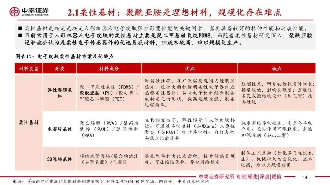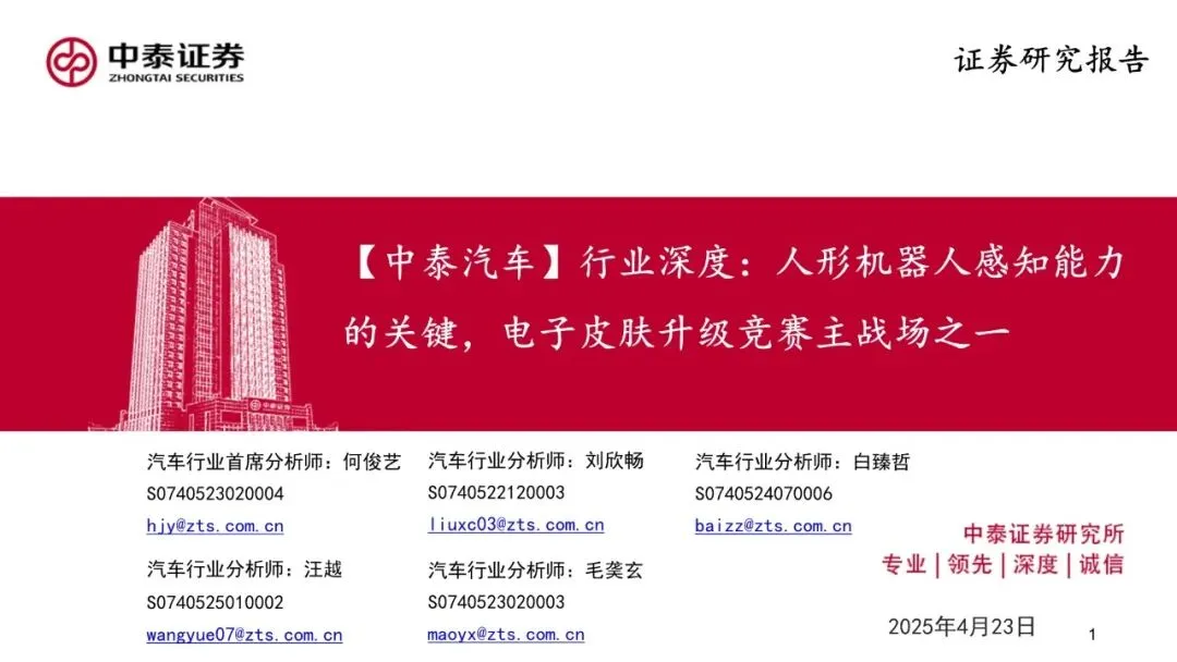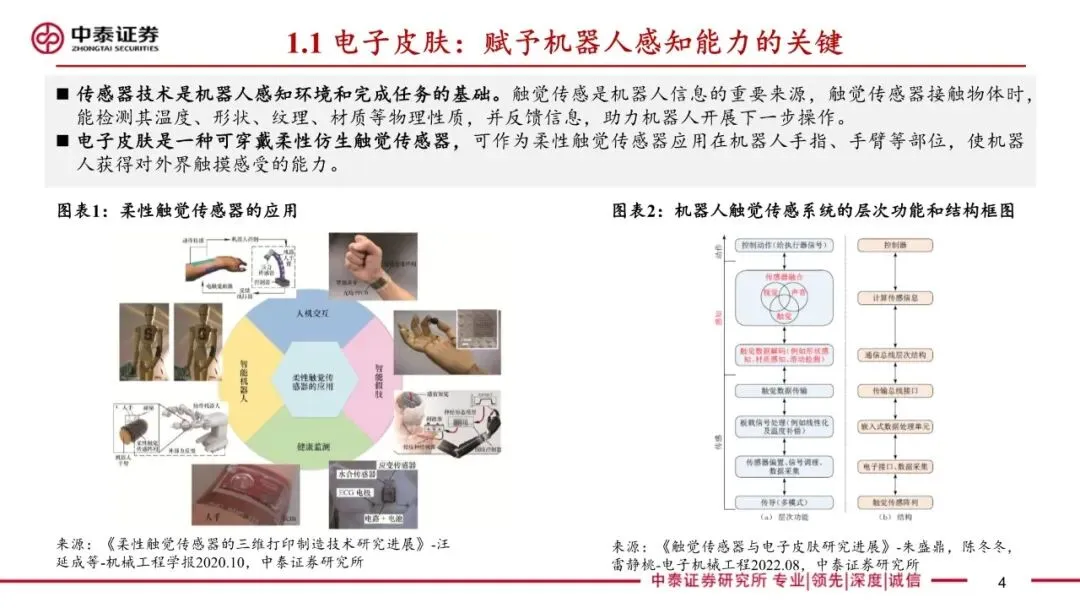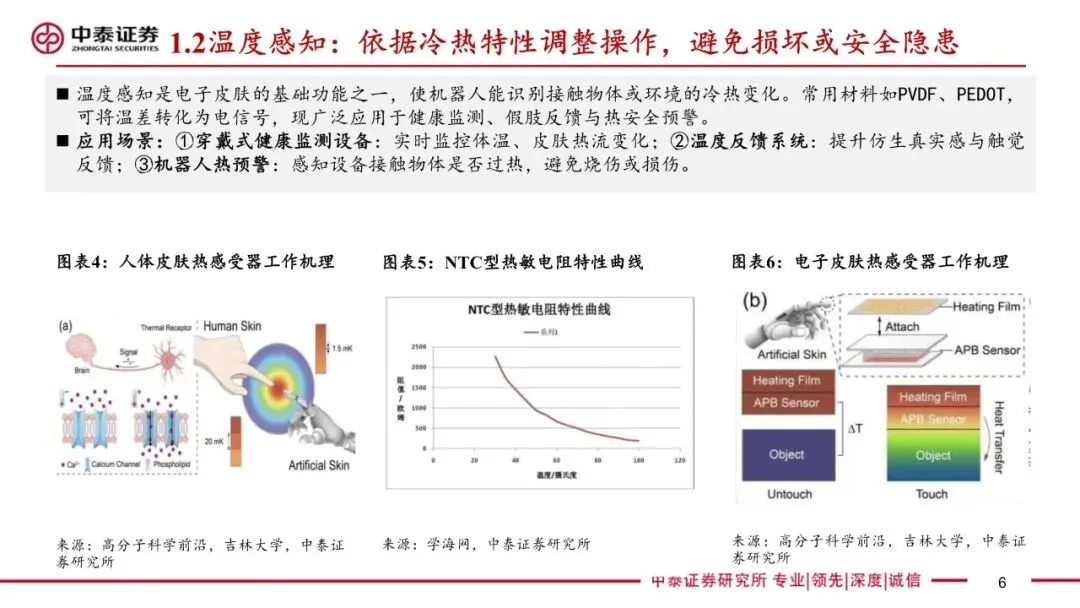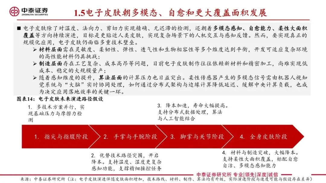电子皮肤是一种柔性触觉传感器,是机器人感知环境和完成任务的基础。具备1)温度感知:检测冷热变化;2)法向力感知:感知垂直压力,判断接触、抓握力度与物体硬度等;3)剪切力感知:识别滑动或摩擦力,助力稳定性判断、纹理识别与方向判断等操作。电子皮肤最常见的是压阻式、电容式、压电式,还有比较新颖的光学式和电磁式,其中压阻式技术简单应用广泛,电磁式因可以感知切向力而有望成为未来演进方向。未来,电子皮肤将朝着高精度、长寿命、多模态感知和自愈能力方向发展,但材料、制造工艺和算法优化仍是实现规模化应用的主要挑战。
