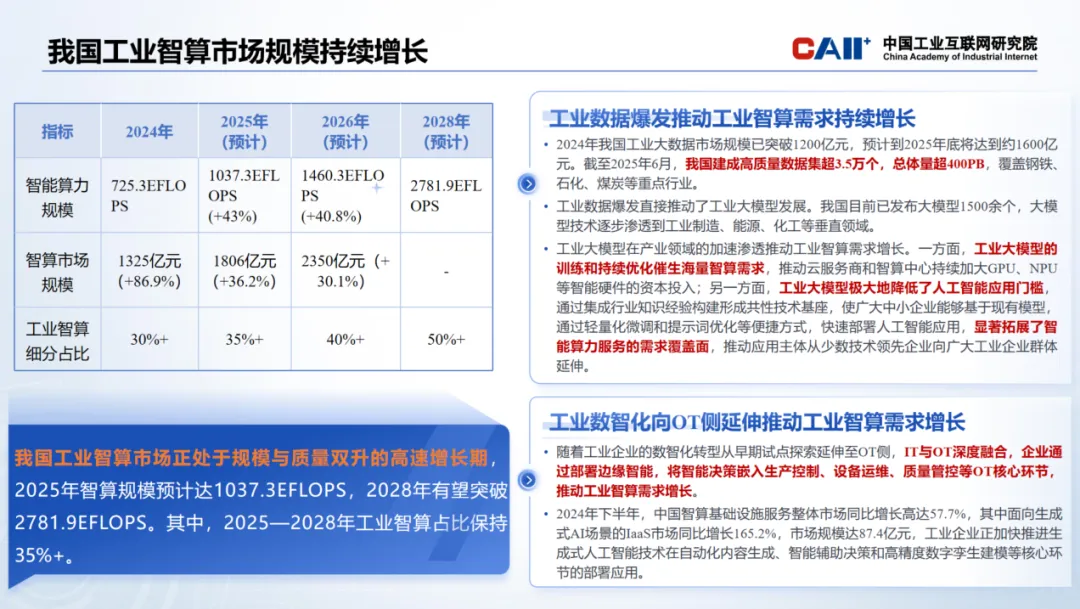 市场高速增长背后,是工业数据爆发式增长与工业数智化向OT侧延伸两大核心动力。经预测,2025年底我国工业大数据市场规模突破1600亿元,截至2025年6月,高质量数据集超3.5万个、总体量超400PB,为工业智算提供丰富“数据燃料”;工业数智化向OT侧深度延伸,IT与OT融合推动边缘智能部署,工业企业加速部署生成式AI技术,持续拉动智算需求扩容。