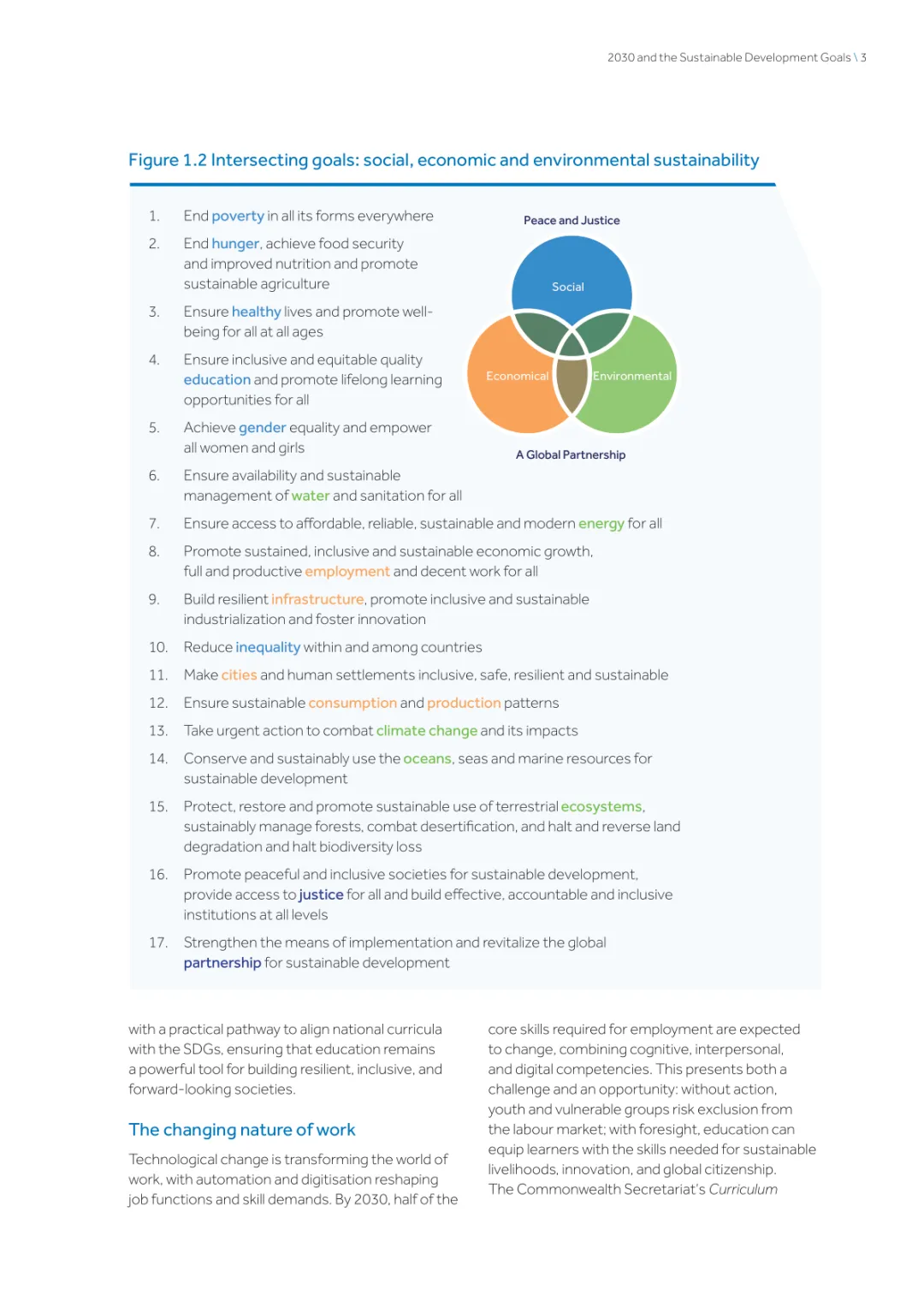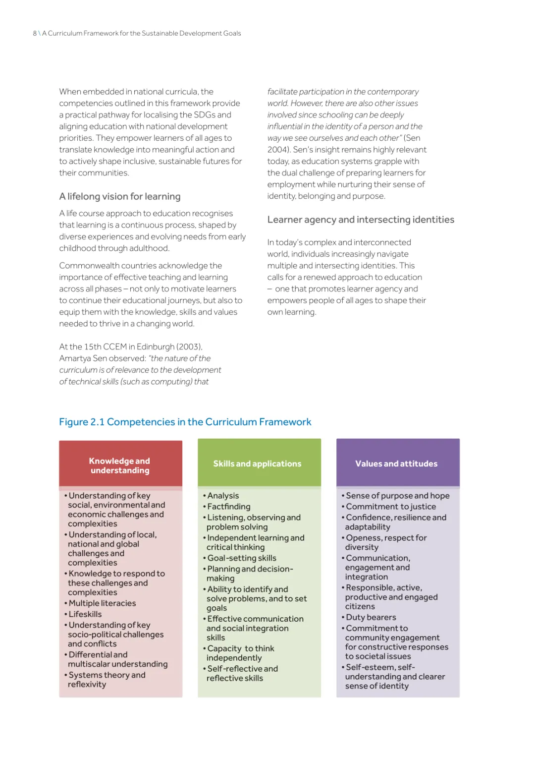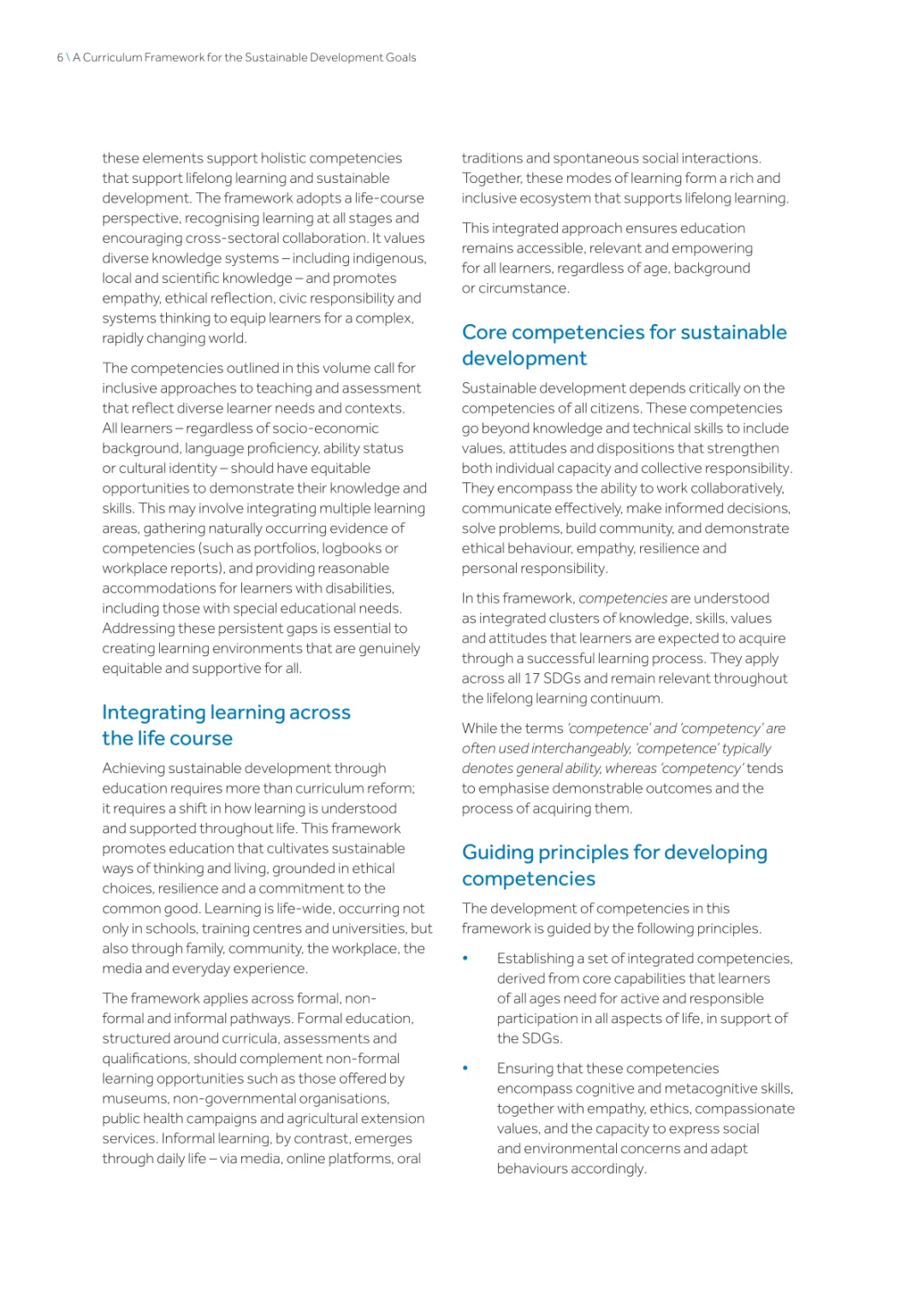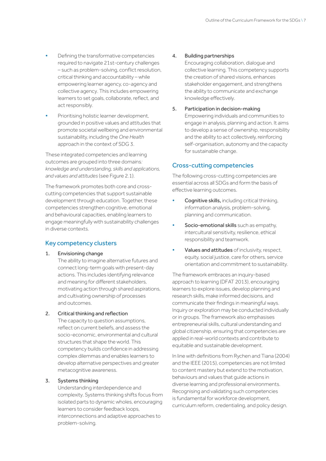 报告构建了覆盖终身学习的课程框架,强调教育是实现可持续发展的关键催化剂。框架立足 “人、地球、繁荣、和平、伙伴关系” 五大支柱,将各项目标有机融入不同教育阶段与学习场景。框架明确核心能力培养方向,涵盖知识理解、技能应用与价值态度三大维度,聚焦系统思维、批判性思考、协作伙伴关系等关键素养。课程设计遵循灵活性原则,适配正式、非正式及非正规学习场景,兼顾本土语境与全球视野,整合科学知识与传统智慧,助力学习者应对气候变化、 inequality 等全球挑战。实施路径上,框架倡导跨学科融合与多方协作,鼓励政策制定者、教育工作者与社区联动。通过将可持续发展理念嵌入课程体系、强化教师培训、推广实践式学习,助力学习者成长为负责任的全球公民,为 2030 年议程落地提供坚实教育支撑,推动社会向更公正、包容、可持续的方向转型。