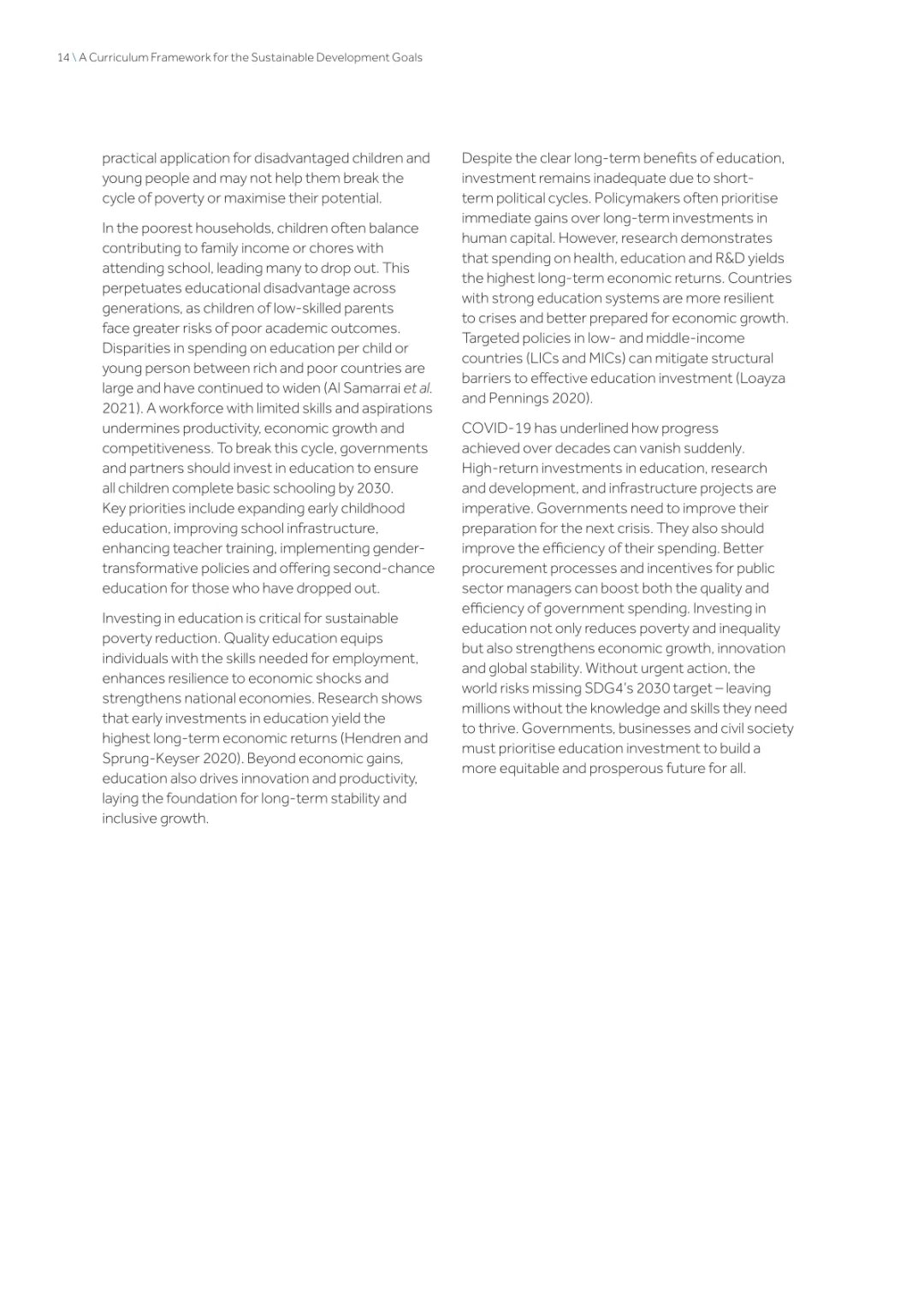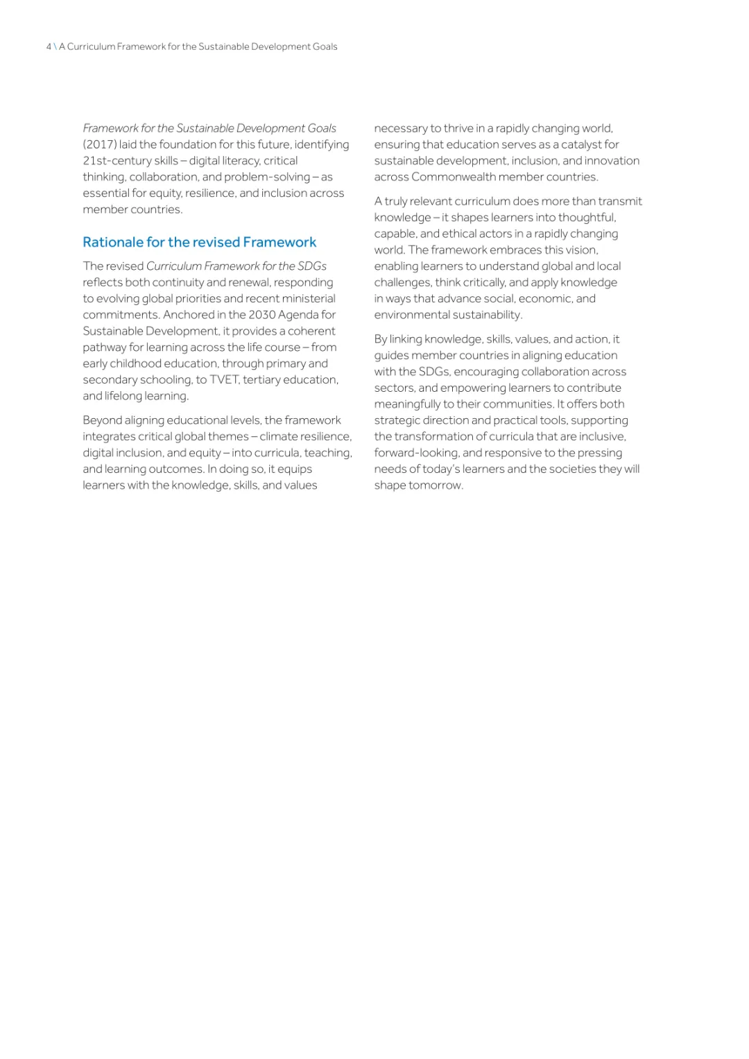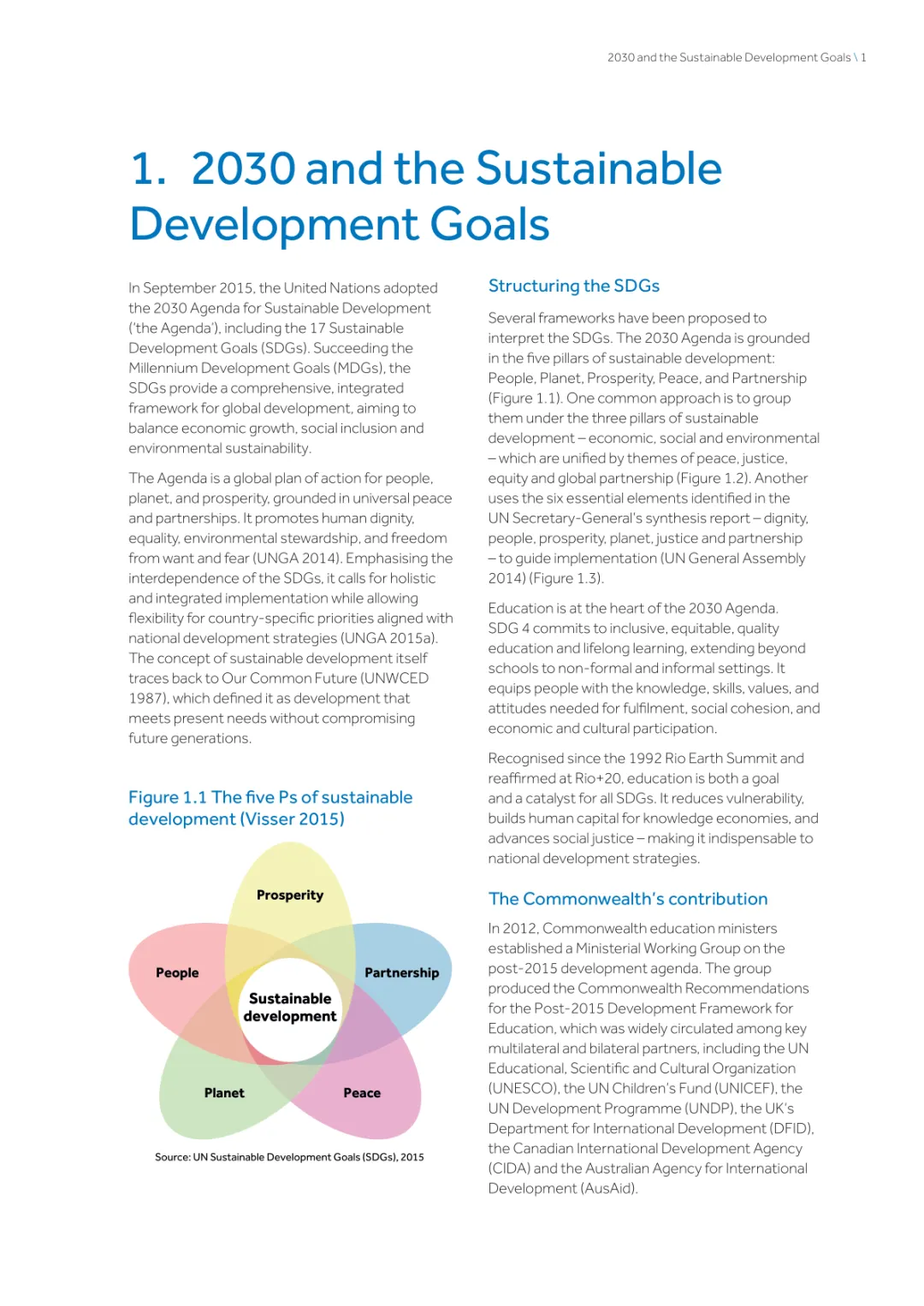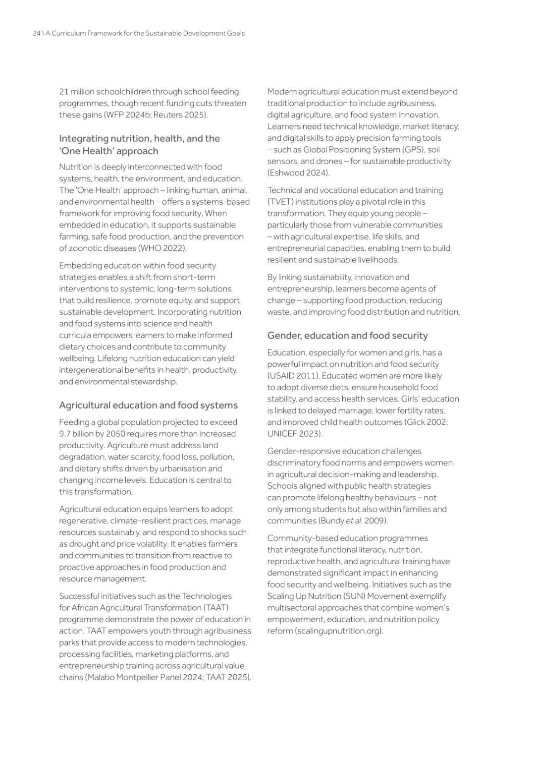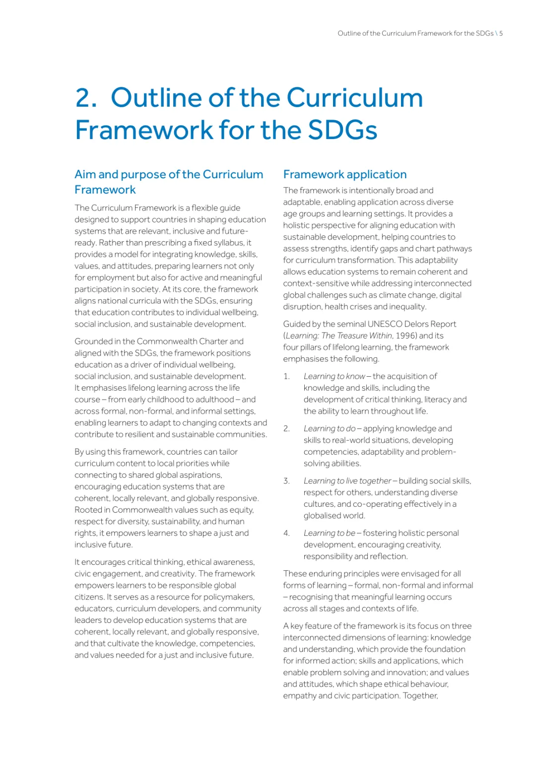 报告构建了覆盖终身学习的课程框架,强调教育是实现可持续发展的关键催化剂。框架立足 “人、地球、繁荣、和平、伙伴关系” 五大支柱,将各项目标有机融入不同教育阶段与学习场景。框架明确核心能力培养方向,涵盖知识理解、技能应用与价值态度三大维度,聚焦系统思维、批判性思考、协作伙伴关系等关键素养。课程设计遵循灵活性原则,适配正式、非正式及非正规学习场景,兼顾本土语境与全球视野,整合科学知识与传统智慧,助力学习者应对气候变化、 inequality 等全球挑战。实施路径上,框架倡导跨学科融合与多方协作,鼓励政策制定者、教育工作者与社区联动。通过将可持续发展理念嵌入课程体系、强化教师培训、推广实践式学习,助力学习者成长为负责任的全球公民,为 2030 年议程落地提供坚实教育支撑,推动社会向更公正、包容、可持续的方向转型。