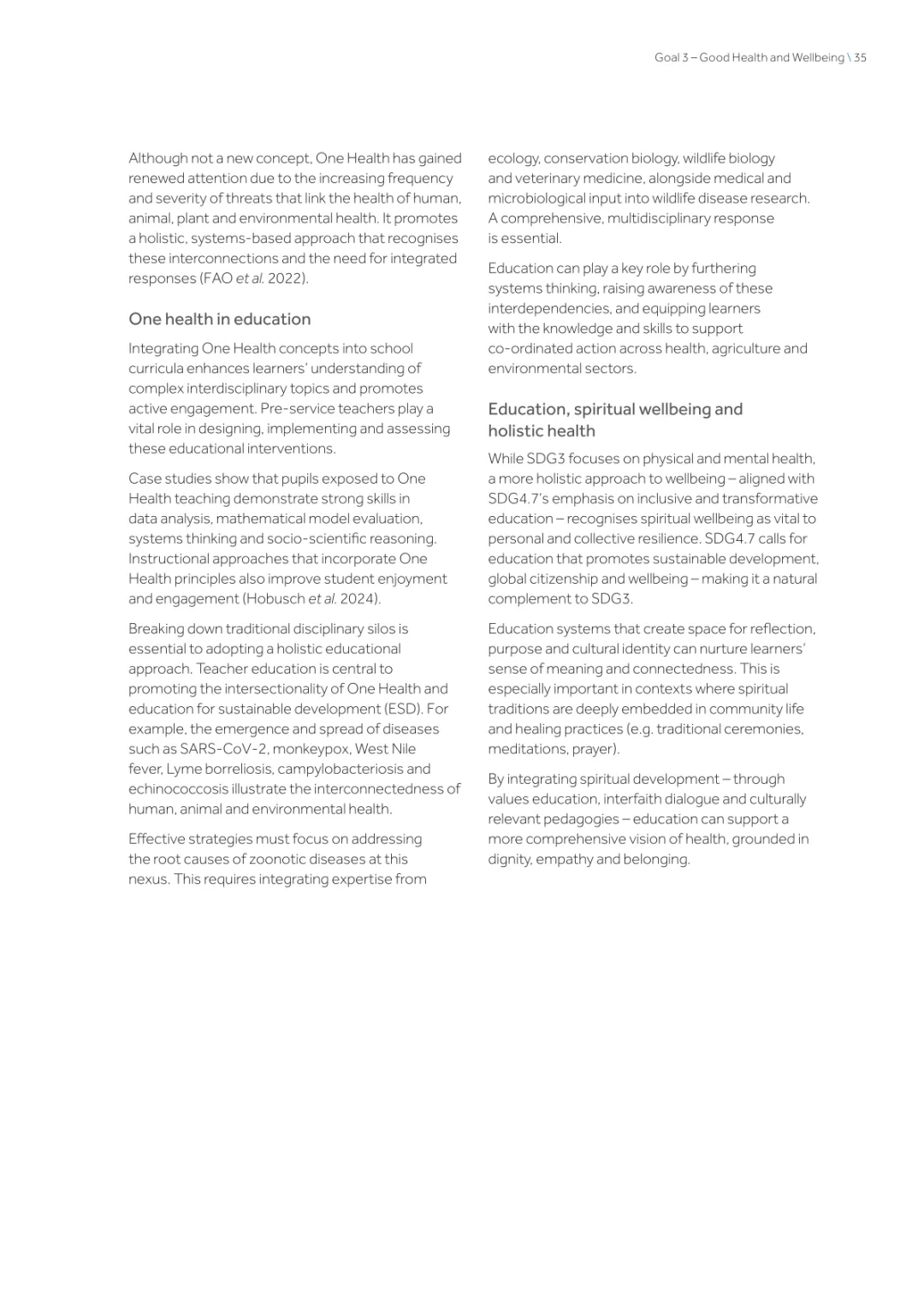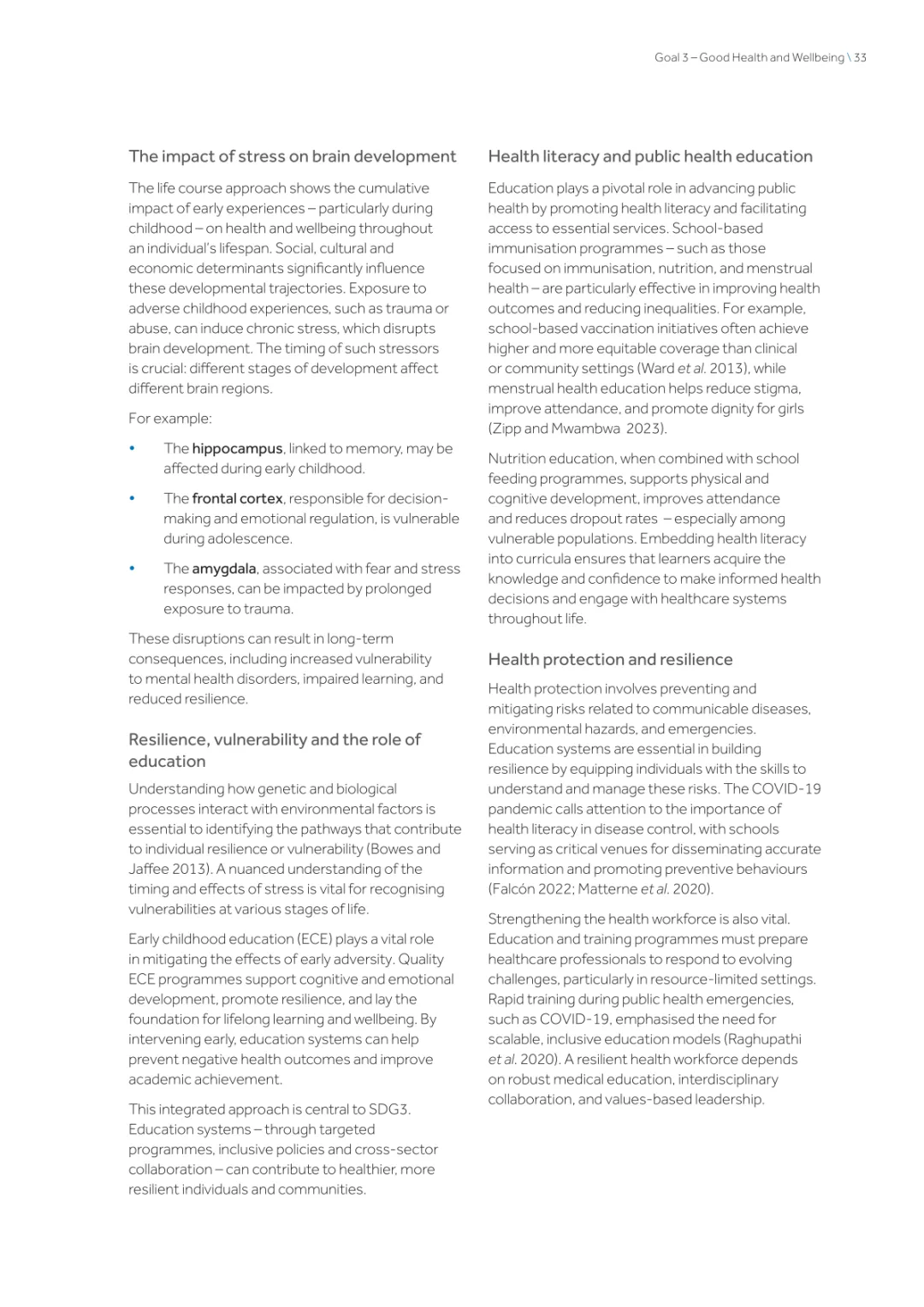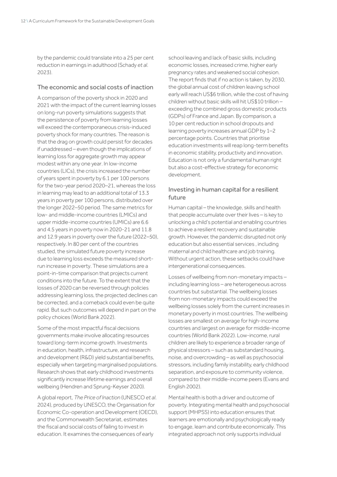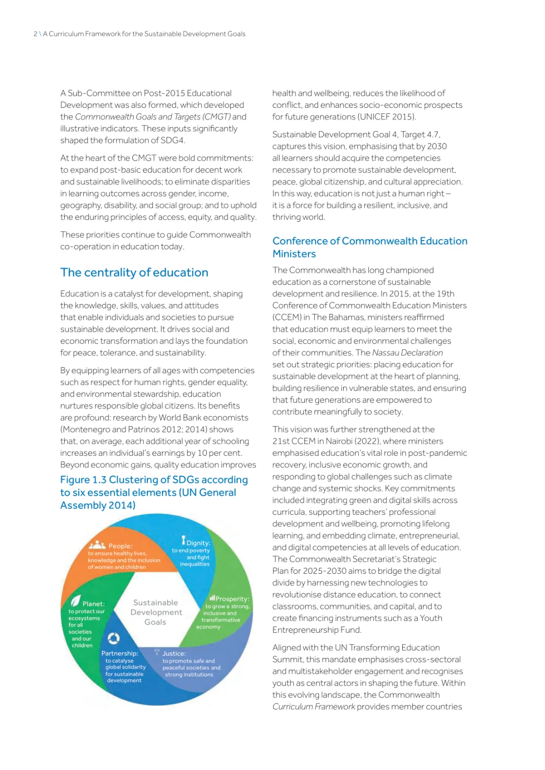 报告构建了覆盖终身学习的课程框架,强调教育是实现可持续发展的关键催化剂。框架立足 “人、地球、繁荣、和平、伙伴关系” 五大支柱,将各项目标有机融入不同教育阶段与学习场景。框架明确核心能力培养方向,涵盖知识理解、技能应用与价值态度三大维度,聚焦系统思维、批判性思考、协作伙伴关系等关键素养。课程设计遵循灵活性原则,适配正式、非正式及非正规学习场景,兼顾本土语境与全球视野,整合科学知识与传统智慧,助力学习者应对气候变化、 inequality 等全球挑战。实施路径上,框架倡导跨学科融合与多方协作,鼓励政策制定者、教育工作者与社区联动。通过将可持续发展理念嵌入课程体系、强化教师培训、推广实践式学习,助力学习者成长为负责任的全球公民,为 2030 年议程落地提供坚实教育支撑,推动社会向更公正、包容、可持续的方向转型。