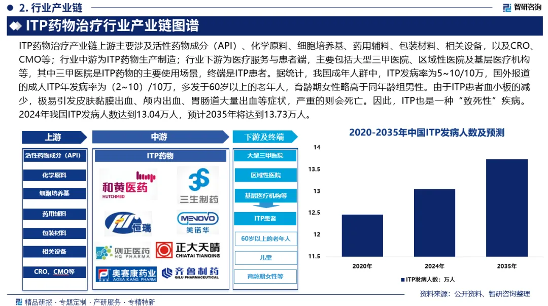 产业链核心节点:ITP药物治疗产业链上游主要涉及活性药物成分(API)、化学原料、细胞培养基、药用辅料、包装材料、相关设备,以及CRO、CMO等;行业中游为ITP药物生产制造;行业下游为医疗服务与患者端,主要包括大型三甲医院、区域性医院及基层医疗机构等,其中三甲医院是ITP药物的主要使用场景,终端是ITP患者。