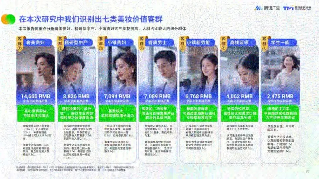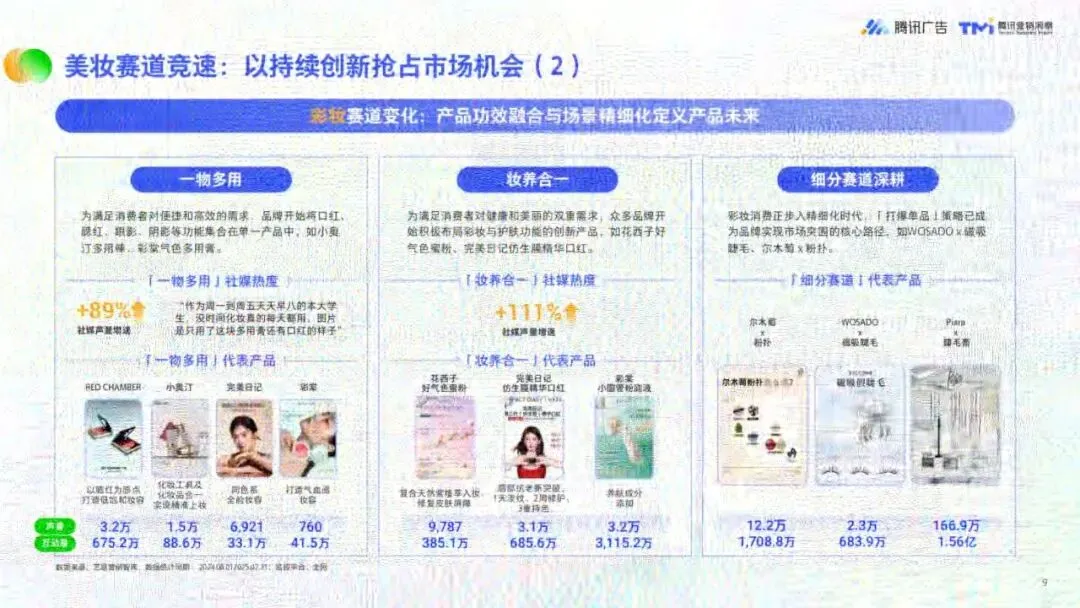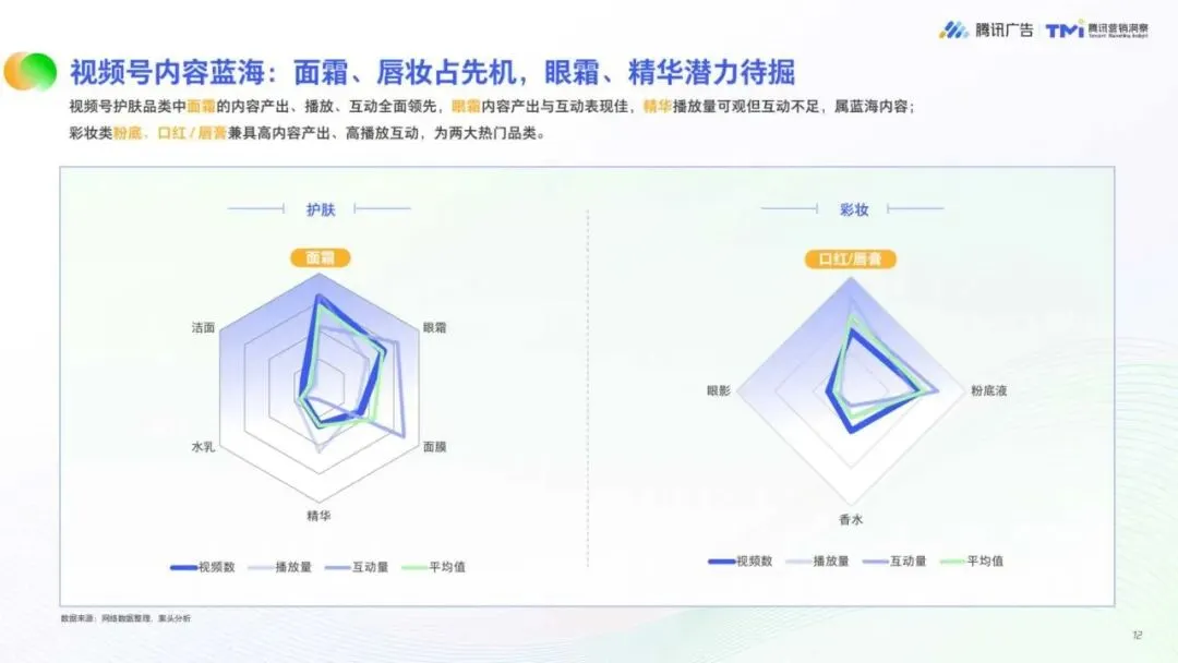 核心客群分化明显,奢美贵妇、精研型中产、小镇贵妇为高价值群体,需求分别聚焦高端功效、成分理性、消费升级。头部品牌通过“公域引流+私域留存”模式实现增长,视频号内容以面霜、口红、粉底液等品类互动性最强,礼赠节点(3月、5月、8月)成为销售高峰。