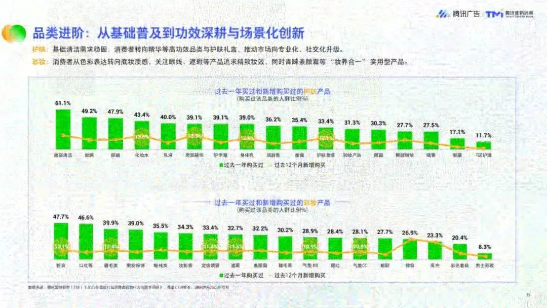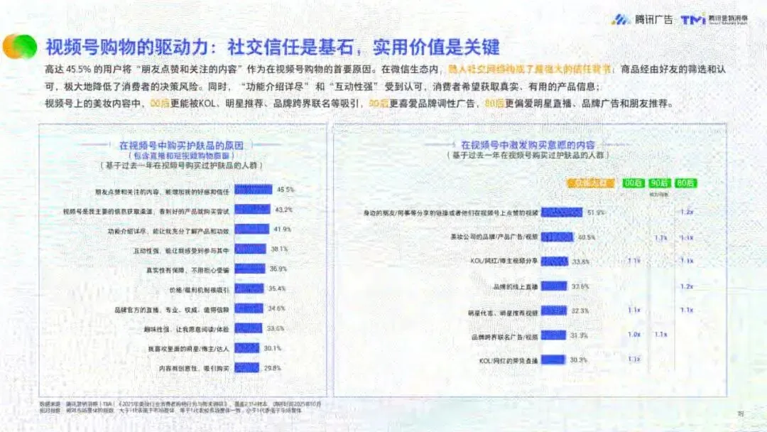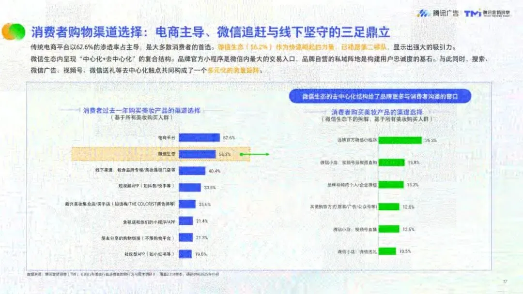 消费趋势上,美妆消费理性化,护肤品类(尤其是高端功效型产品)引领升级,彩妆聚焦“妆养合一”与场景精细化,IP联名成为品牌破圈关键。微信生态内,62.6%的消费者通过电商平台购买美妆,56.2%选择微信生态,品牌官方小程序为核心交易入口,视频号种草与微信送礼构建社交购物新闭环。