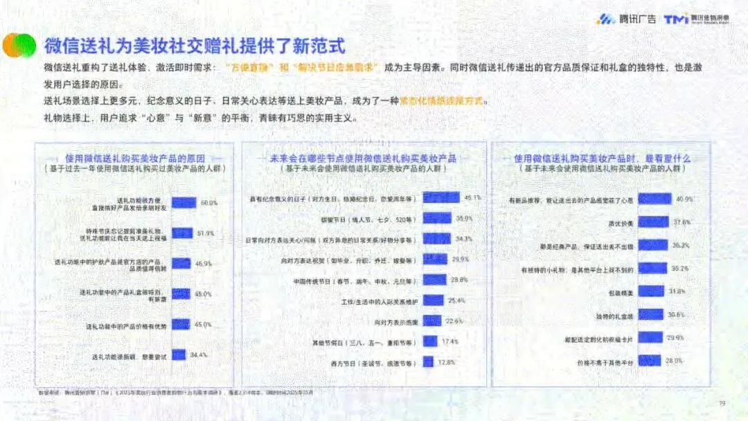 美妆行业步入存量竞争与增量探索新阶段,从“流量争夺”转向“全域经营”。2024年中国化妆品零售规模达4357亿元,线上占比超51%,视频号直播GMV超三倍增长,美妆作为TOP3行业,礼赠节点拉动效应显著。