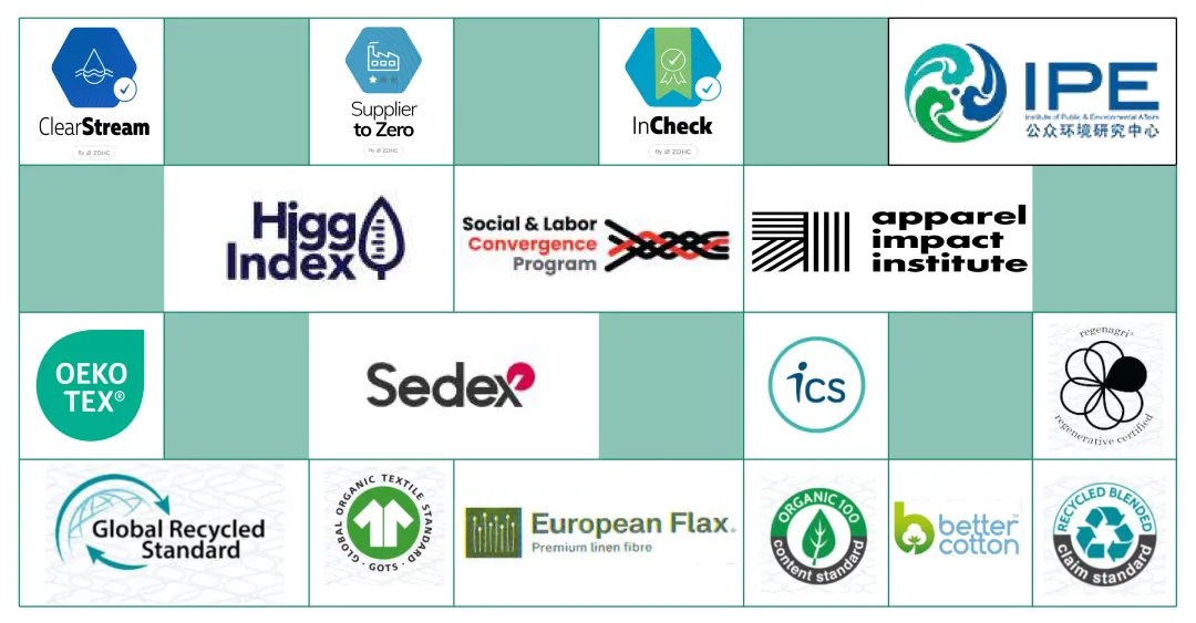 公司积极参与Higg FEM、Higg FDM、SLCP、IPE、ZDHC、Sedex、ICS等国内外可持续发展平台与认证体系,推动环境数据披露、化学品管理、社会责任合规等方面的持续改进。