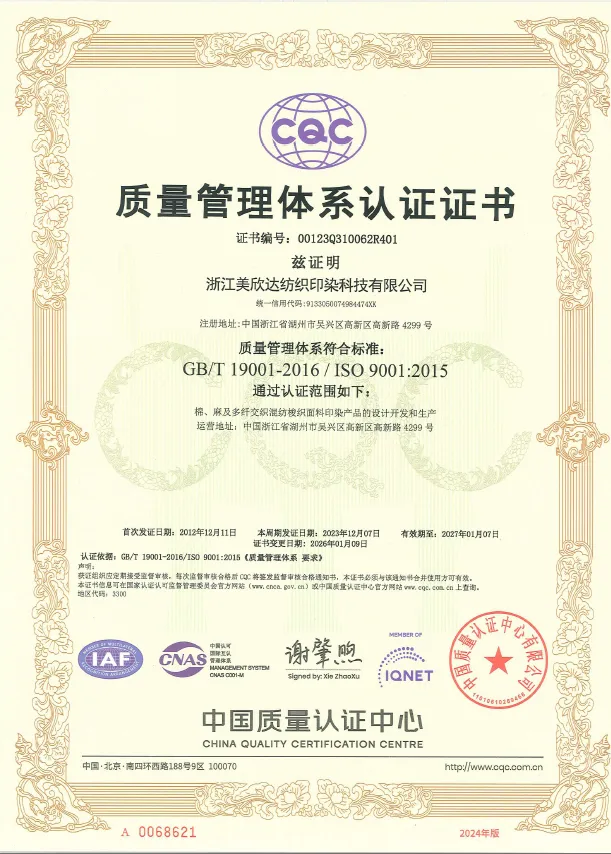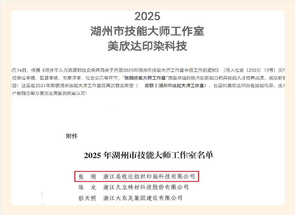美欣达纺织印染科技有限公司(以下简称“美欣达”)以科技为核心、品质为基础,在纺织印染领域深耕三十余年,致力于推动行业可持续发展。公司注册资本11666.8万元,拥有全产业链布局与核心技术优势,稳居国内梭织面料印染领域的领军地位。近年来,公司荣获“中国印染企业三十强”、“国家级绿色工厂”、“国家级绿色供应链示范企业”、入选“浙江省零碳(近零碳)工厂培育建设名单”、“单项冠军”等多项荣誉。