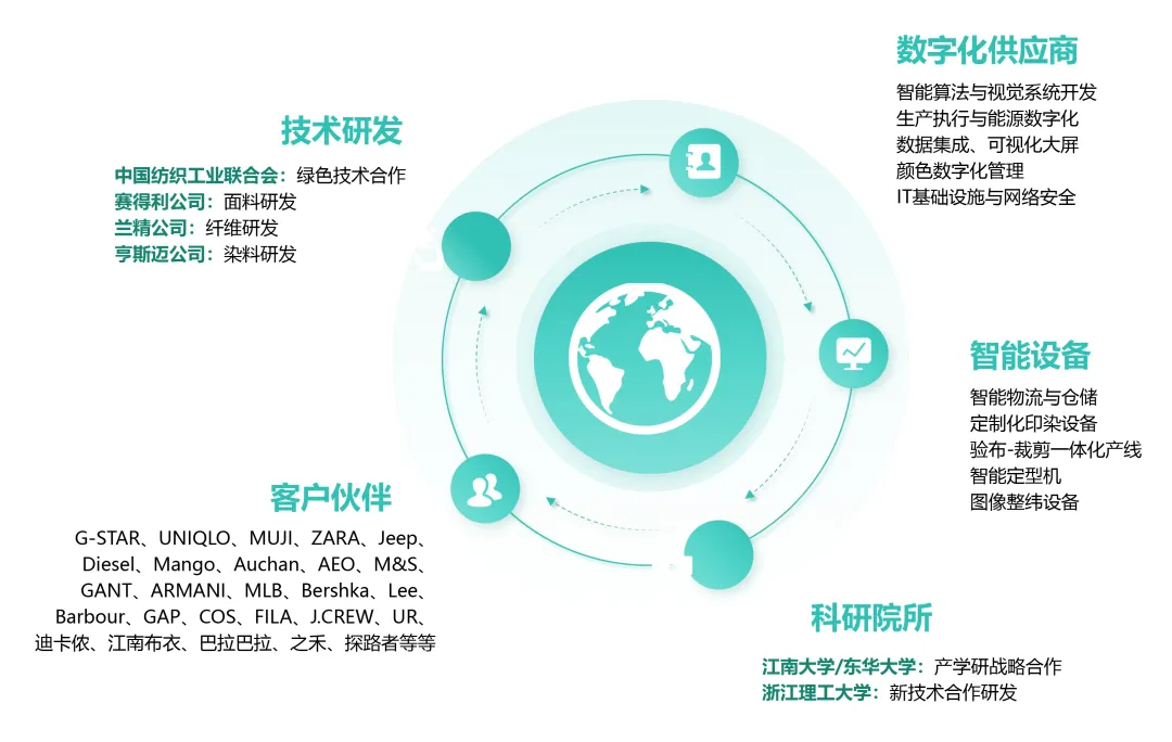 美欣达与多家数字化供应商、技术研发机构、智能设备企业及国际品牌客户开展深度合作,共同推动绿色技术与智能制造落地。合作伙伴包括百度、赛得利、兰精、亨斯迈、G-STAR、UNIQLO、ZARA、迪卡侬等。