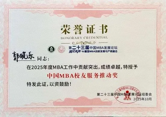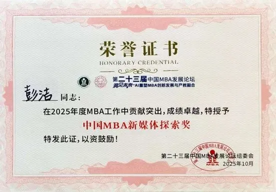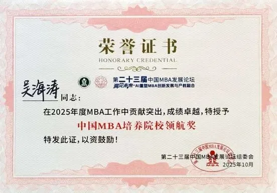 院长兼MBA教育中心主任吴海涛教授荣获“2025年度商科教育领军人物”,副院长兼MBA教育中心副主任杜鹏教授荣获“2025年度商科教育‘鸿儒’奖”,MBA教育中心学术主任张璇教授荣获“2025年度商科教育运营创新奖”,刘文通、周丽丽荣获“2025年度商科教育卓越学者”,MBA联合会主席姚爽等荣获“2025年度商科教育优秀联合会主席”,学员曹昊等荣获“2025年度商科教育新秀100”奖,校友梁菡等荣获“2025年度商科教育卓越校友”奖。