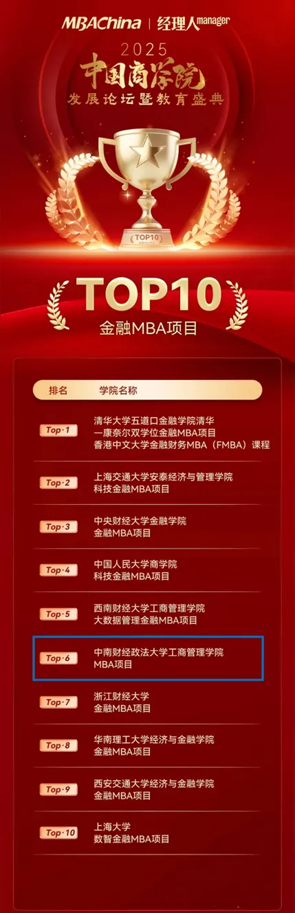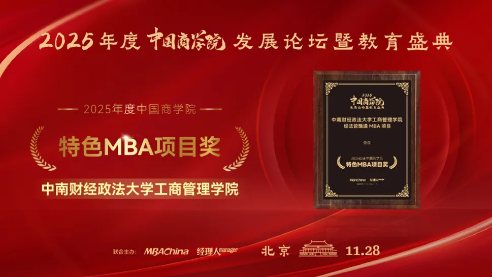 2025年,中南财经政法大学工商管理学院MBA以卓越的成绩彰显了商科教育的实力与担当。未来,中心将持续深化教育改革、拓宽国际视野、强化社会责任,为培养更多具备全球竞争力的商界领袖,为推动中国商科教育高质量发展作出新的更大贡献!