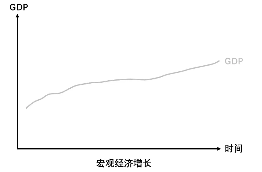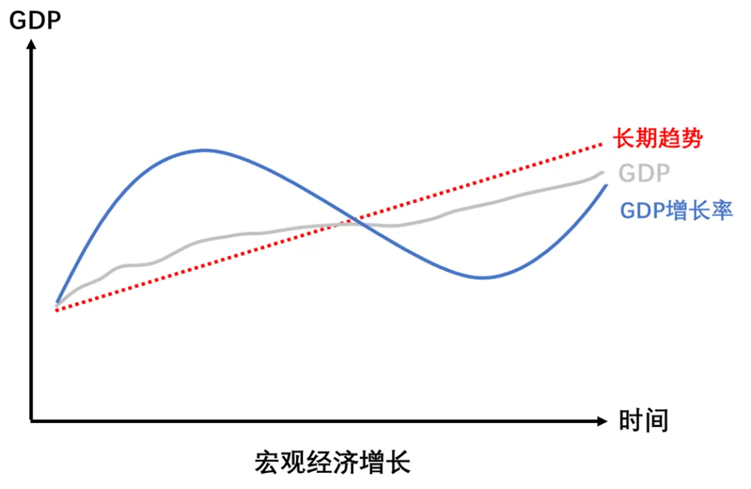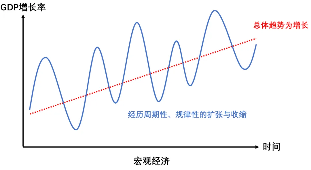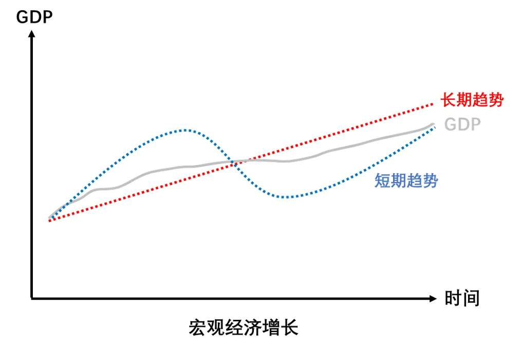 通过使用GDP增长率描述经济增长,经济学家发现宏观经济在短期会经历周期性、规律性的扩张与收缩,而长期会沿着总体趋势增长或萎缩,如图: