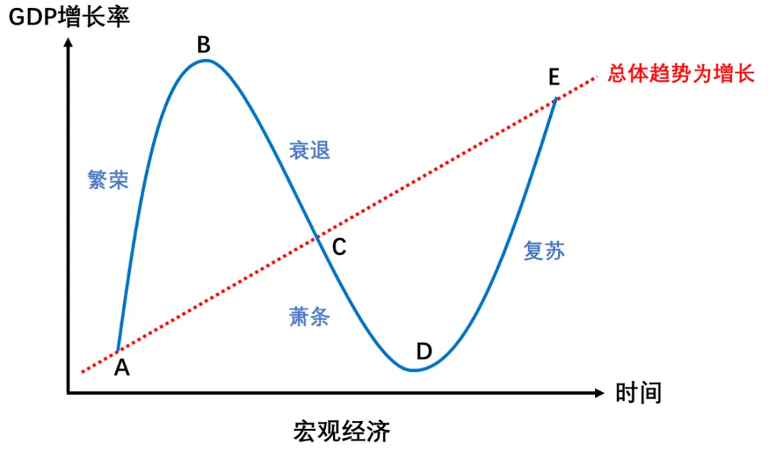 在一个经济周期内,经济将依次经历繁荣、衰退、萧条、复苏,四个阶段:
