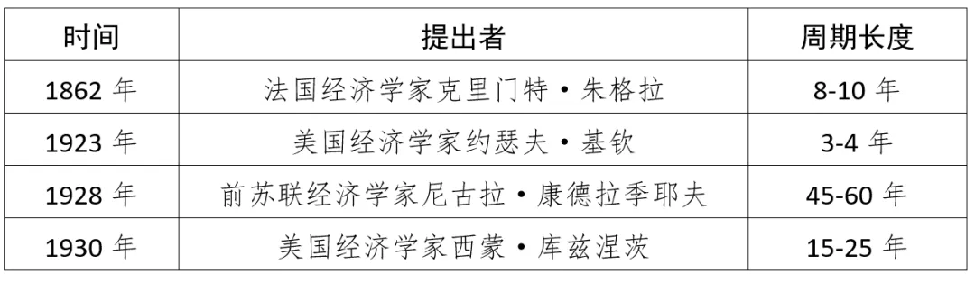 1939年,美籍奥国经济学家约瑟夫·阿洛伊斯·熊彼特提出,经济周期与技术创新密切相关,经济周期由长、中、短三种周期嵌套而成,即大周期套中周期,中周期还会套小的周期,如同俄罗斯套娃一般,其中: