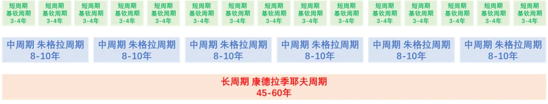 长周期为康德拉季耶夫周期,包含6个中周期;