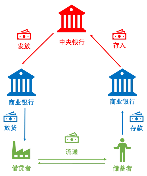 中央银行又称“银行的银行”,它负责货币的供给,把货币供应给商业银行,再由商业银行通过贷款的形式供应给社会。同时,中央银行也吸收商业银行的存款,社会上的储蓄者把货币存在商业银行里,商业银行再存入中央银行,形成循环。