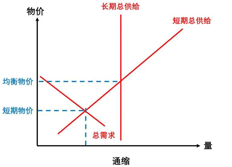 随着货币供给的增加,短期物价上涨,总需求增加,总需求曲线向右移动,逐渐回归经济均衡。这个过程中货币将贬值。